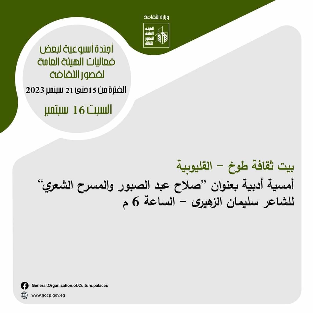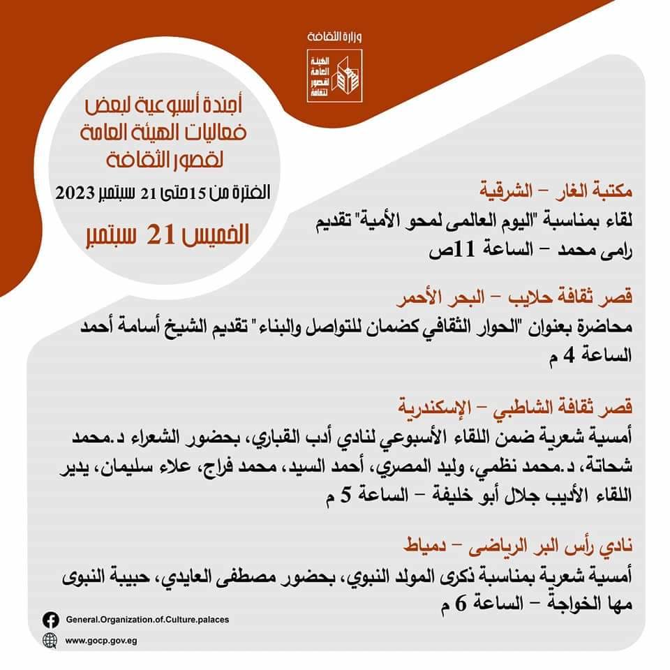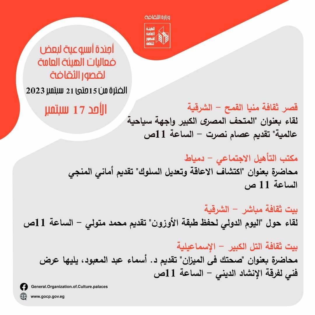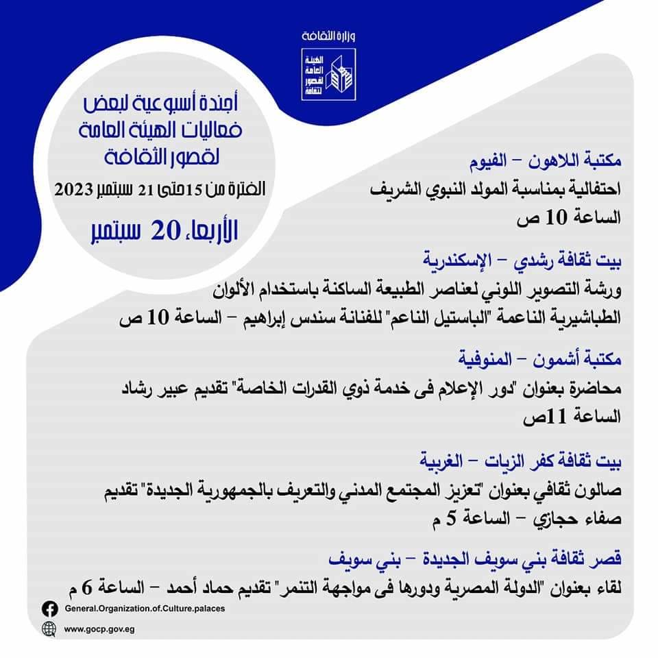 ومن البحيرة إلى مطروح يستعد قصر ثقافة مرسى مطروح لاستقبال ملتقى مراسم السلوم للرسم والتصوير يوم 18 سبتمبر وتستمر فعالياته حتى نهاية الشهر الحالي، وفي اليوم ذاته يشهد قصر ثقافة العريش الملتقى الثاني عشر لشباب المحافظات الحدودية ضمن مشروع "أهل مصر" ويستمر حتى 25 سبتمبر.