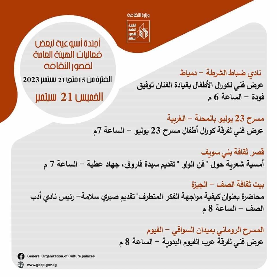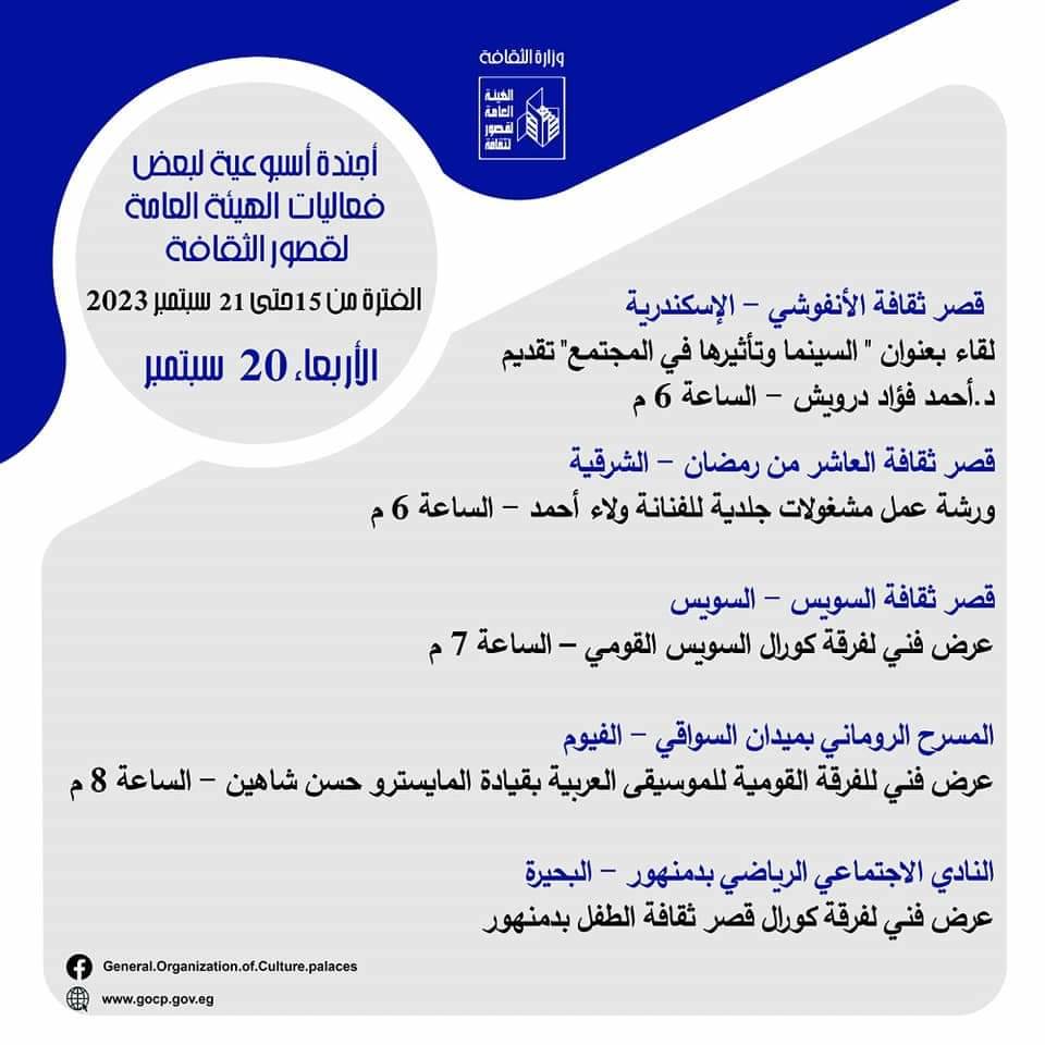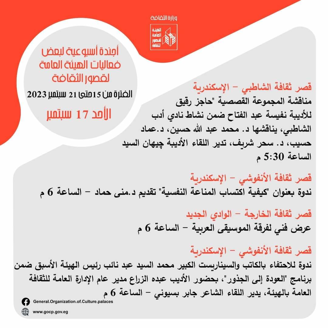 تنشر "بوابة روز اليوسف" تفاصيل الأجندة الأسبوعية التي تضمها فعاليات وأنشطة الهيئة العامة لقصور الثقافة برئاسة عمرو البسيوني، هذا الأسبوع بمجموعة متميزة من الفعاليات الثقافية والفنية، اعتبارا من اليوم الجمعة 15 سبتمبر وحتى يوم 21 سبتمبر الحالي.
