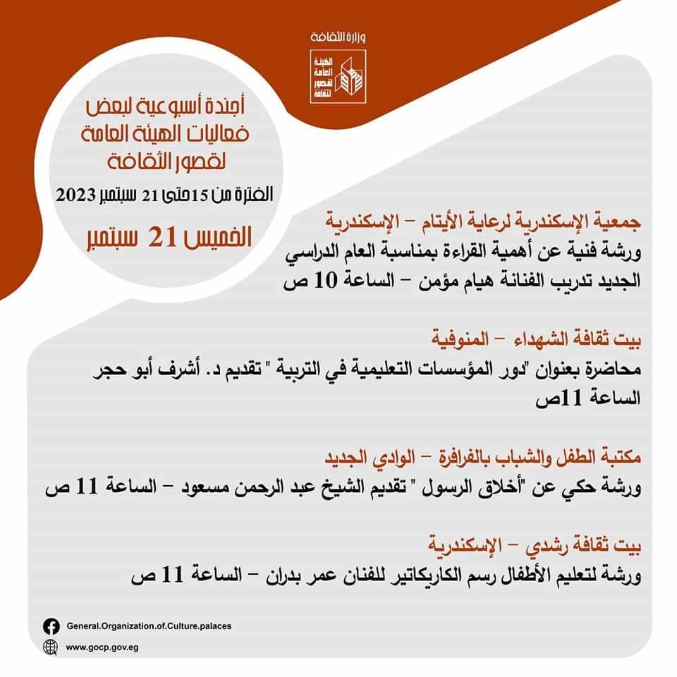 وفي الإسكندرية تنظم هيئة قصور الثقافة مجموعة كبيرة من الفعاليات أهمها لقاء يوم الأحد المقبل 17 سبتمبر بقصر ثقافة الأنفوشي، احتفاء بالكاتب والسيناريست محمد السيد عيد ضمن برنامج "العودة إلى الجذور"، هذا إلى جانب حفل فني بمناسبة ذكرى رحيل فنان الشعب سيد درويش، تحييه فرقة الأنفوشي للموسيقى العربية بقيادة المايسترو هيثم مدحت بسيوني.