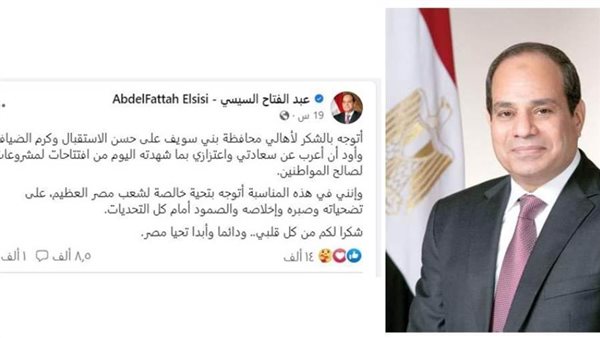 وكان الرئيس عبد الفتاح السيسي، قد نشر عبر صفحته الرسمية على موقع التواصل الاجتماعي "فيسبوك" ،منشوراُ توجه خلاله بالشكر لأهالي محافظة بني سويف على حسن الاستقبال وكرم الضيافة، معبراً عن سعادته واعتزازه بما شهده من افتتاحات لمشروعات لصالح المواطنين، وموجها تحية خالصة لشعب مصر العظيم، على تضحياته وصبره وإخلاصه والصمود أمام كل التحديات ، واختتمها "شكرا لكم من كل قلبي.. ودائما وأبدا تحيا مصر"