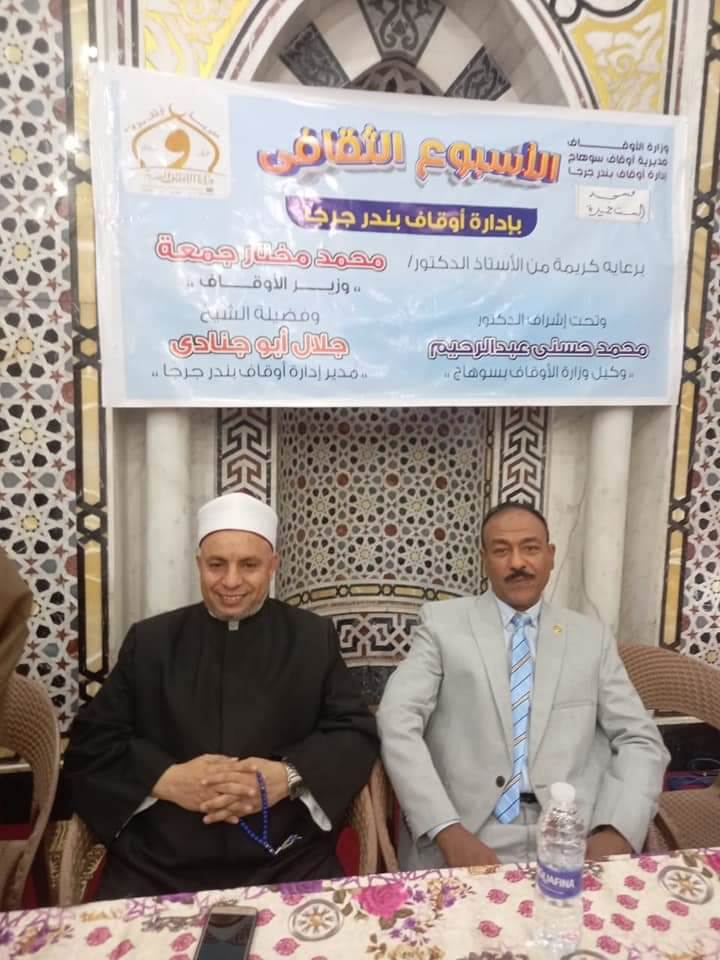 افتتح الدكتور محمد حسنى عبدالرحيم وكيل وزارة الأوقاف بسوهاج، فعاليات الأسبوع الثقافي، وذلك بمسجد"الست حميدة" بإدارة أوقاف "بندر جرجا" التابعة لمديرية أوقاف سوهاج فى إطار الدور التثقيفي الذي تقوم به وزارة الأوقاف تحت إشراف الدكتور محمد مختار جمعة وزير الأوقاف .