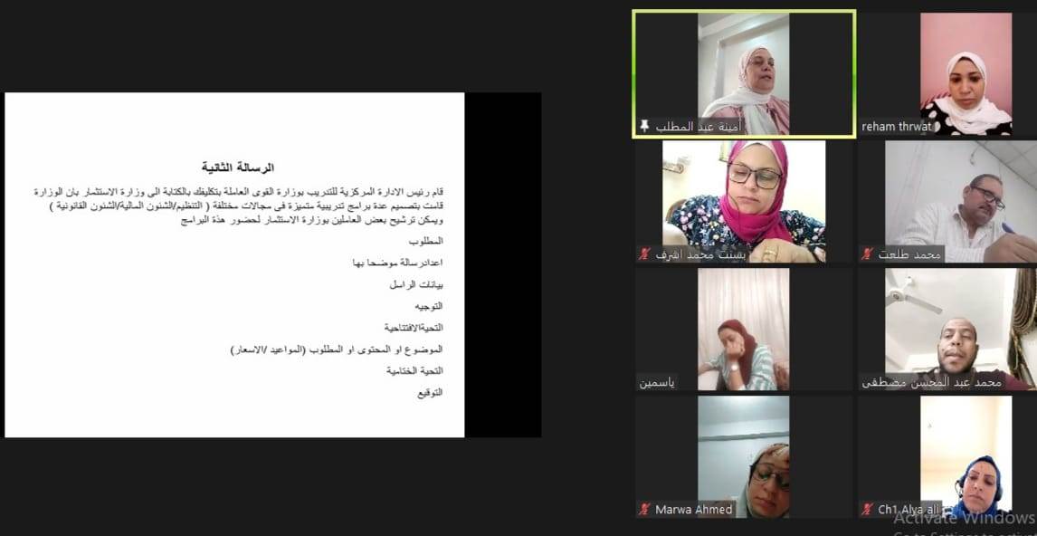 تناولت أمينة عبد المطلب رئيس الإدارة المركزية للتدريب بالجهاز المركزي للتنظيم والإدارة سابقا، خلال ورشة اليوم أهم القواعد الأساسية الواجب اتباعها في المكاتبات الإدارية، ومنها الرسائل والتقارير الحكومية.