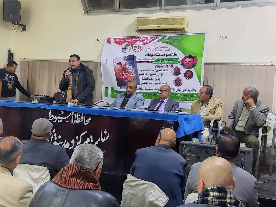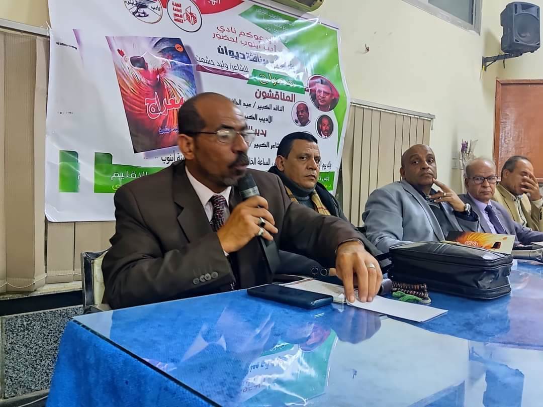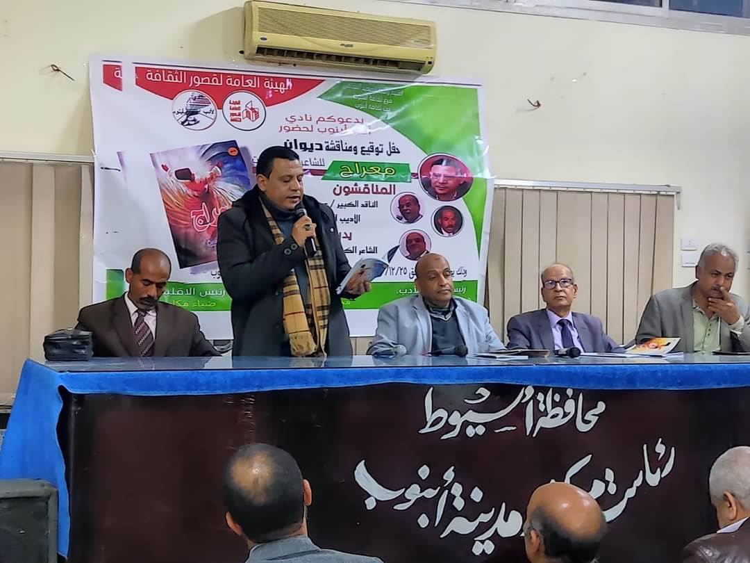 بينما وجه رئيس الإقليم الشكر للشاعر وليد حشمت والذي أضفي تميز أدبي خلال فترة رئاسة لمجلس نادي الأدب المركزي بأسيوط من خلال إقامة العديد من الفاعليات الثقافية الأدبية التي قدمها بينما وجه بأهمية اكتشاف ودعم المواهب الأدبية الشابة مؤكداً أن الثقافة هي محراب الأدب والداعم الأول له