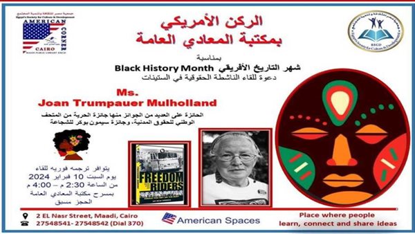 تستضيف مكتبة المعادي العامة التابعة لجمعية مصر للثقافة وتنمية المجتمع بالتعاون مع السفارة الأمريكية بالقاهرة في إطار الاحتفال بشهر التاريخ الأفريقي لقاء مع الناشطة الحقوقية الأمريكية جوان ترومبور مولهولاند التي تعتبر من أشهر الشخصيات منذ الستينات في الولايات المتحدة.