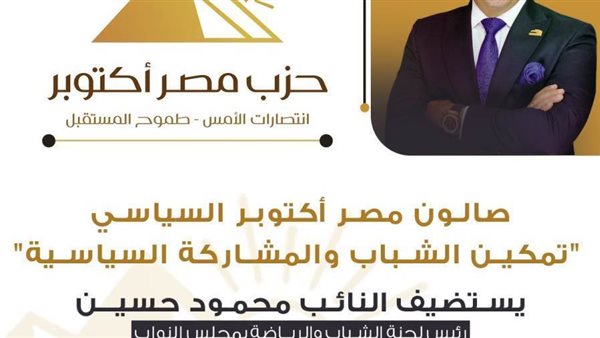 تحت رعاية الدكتورة جيهان مديح، ينظم حزب مصر أكتوبر، الثلاثاء المقبل، صالونا سياسيا تحت عنوان" تمكين الشباب والمشاركة السياسية"، ذلك بحضور الدكتور محمود حسين رئيس لجنة الشباب والرياضة بمجلس النواب، وذلك يوم الثلاثاء المقبل الموافق 27 فبراير 2024، في تمام الساعة السادسة بالمقر الرئيسي للحزب بالتجمع الخامس.