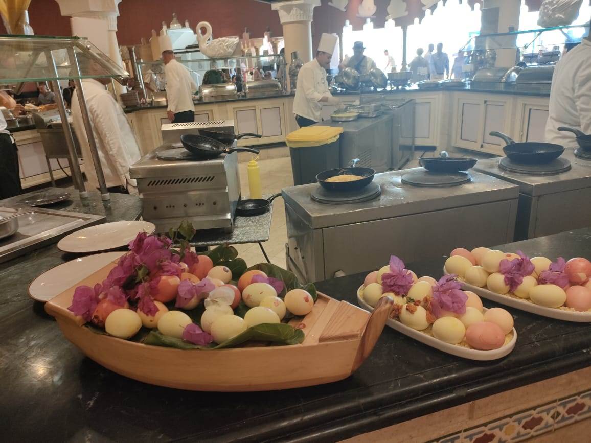 حيث يحتفل السائحون من مختلف الجنسيات بفنادق مرسى علم والغردقة بالبحر الأحمر، حيث قدمت الفنادق المأكولات الخاصة بعيد الفصح والبيض الملون على البوفيه الرئيسي للمطاعم وسط تبادل التهاني بين السائحين الأجانب والعاملين بالفنادق.