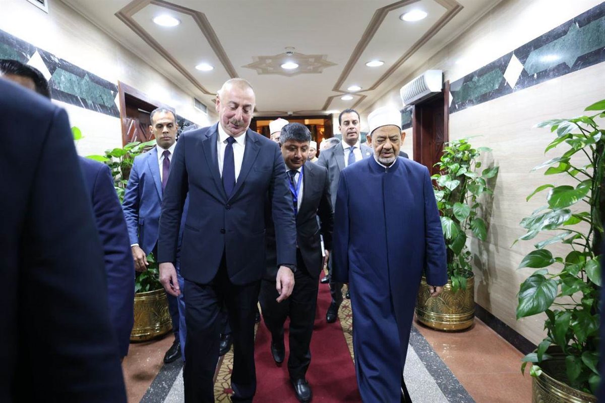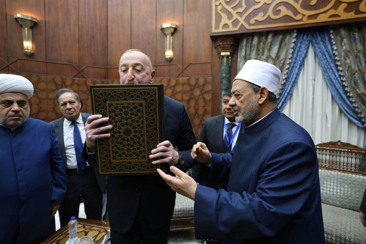 ورحب فضيلة الإمام الأكبر بالرئيس الأذربيجاني والوفد الكريم المرافق لسيادته في رحاب الأزهر الشريف، مؤكدًا عمق العلاقات التاريخية بين الأزهر وأذربيجان، مشيرًا إلى أن الطلاب الأذربيجان الوافدين للدراسة في الأزهر يمثلون ركيزة مهمة في هذه العلاقة، وأننا على استعداد لزيادة المنح الدراسية المقدمة لأبناء أذربيجان للدراسة في الأزهر بما يتناسب مع متطلبات أذربيجان، واستضافة أئمة ودعاة أذربيجان وتدريبهم في أكاديمية الأزهر العالمية لتدريب الأئمة والوعاظ، من خلال برنامج مصمم خصيصى لطبيعة أذربيجان وتطلعاتها المستقبلية.