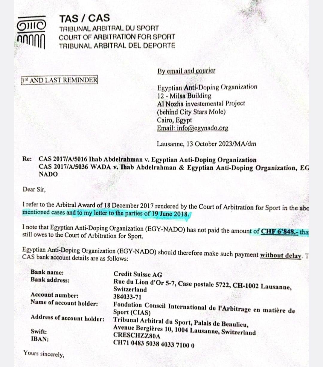 وأضاف: "هذا المسؤول تسبب في تكبد المنظمة المصرية غرامات مالية بسبب سوء إدارته، ودفعت المنظمة غرامات مالية وقعت عليها أثناء فترة إدارته في 20218 و2020، وغيرها من الوفائع المثبتة".