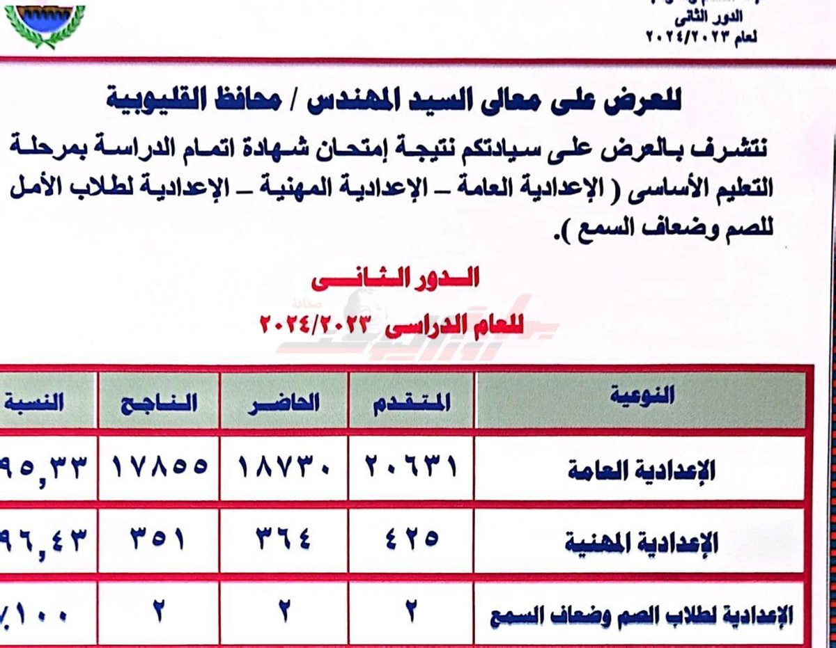 جاء ذلك بحضور سماح ابراهيم وكيل وزارة التربية والتعليم بالقليوبية واسلام عبد الفتاح رئيس كنترول الاعدادية بالقليوبية، حيث تقدم للامتحان الدور الثاني 20631 حضر منهم 18730 ونجح منهم 17855 طالبًا وطالبة.