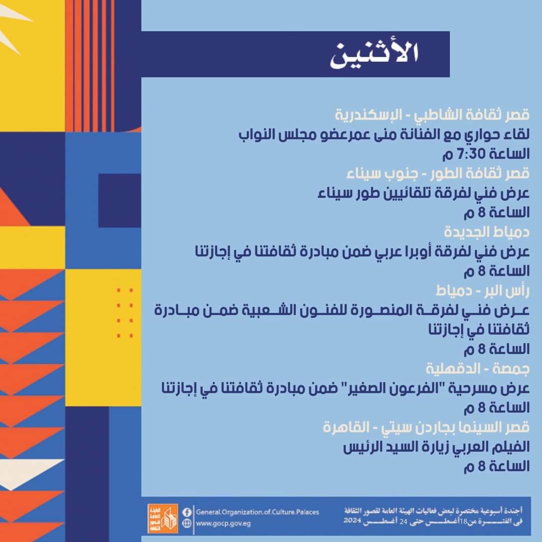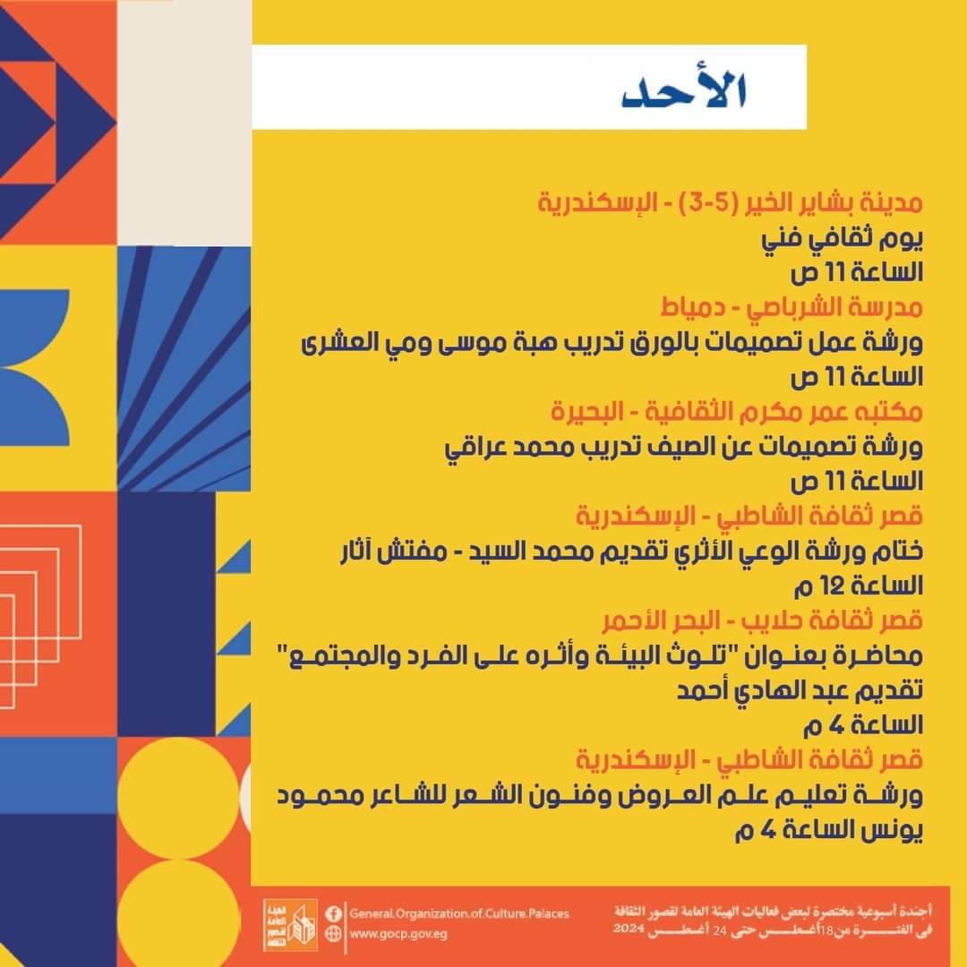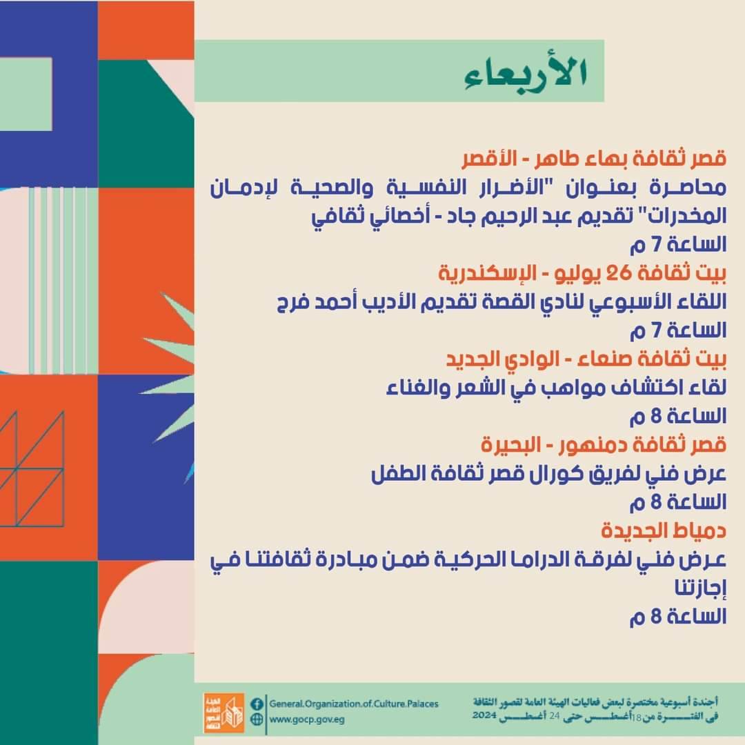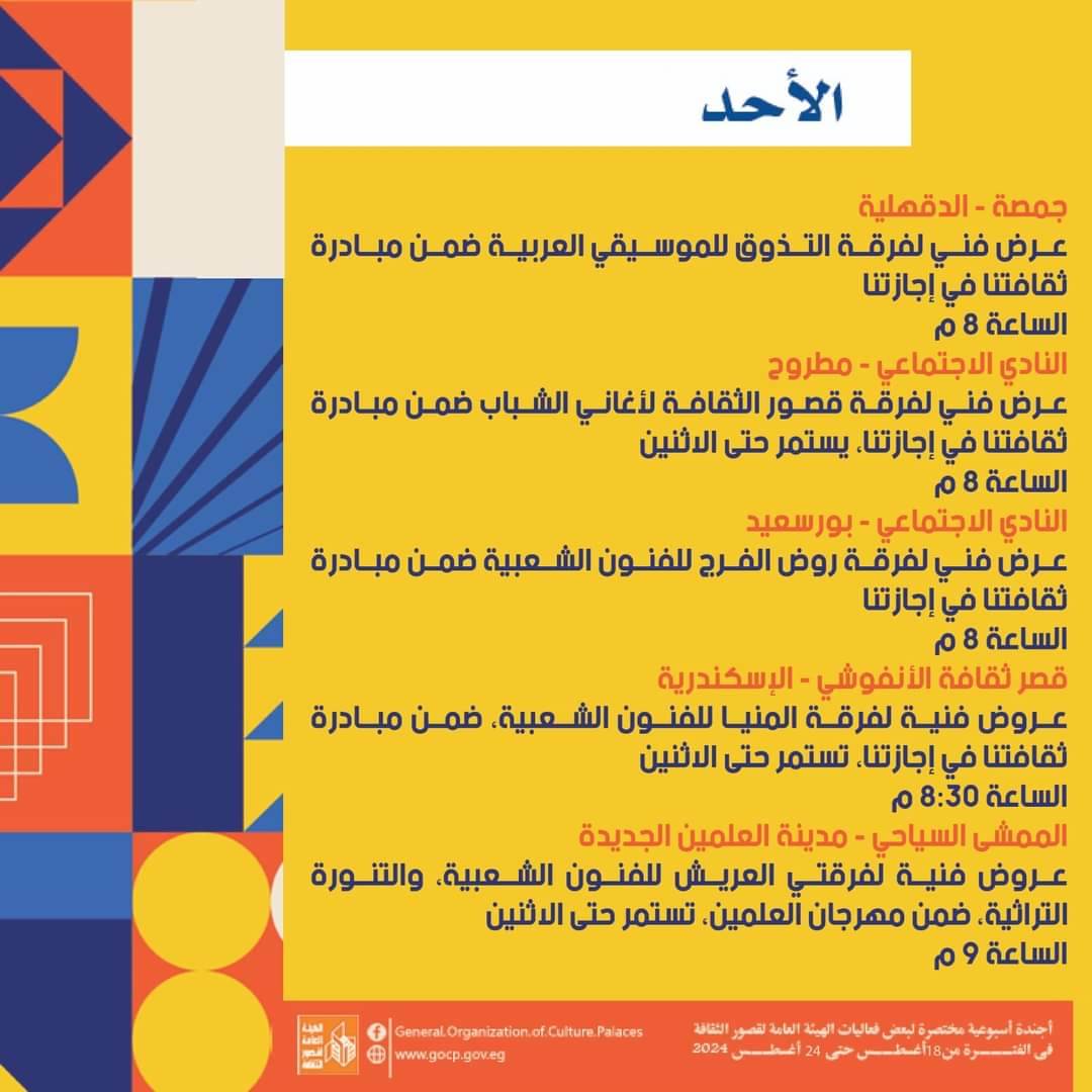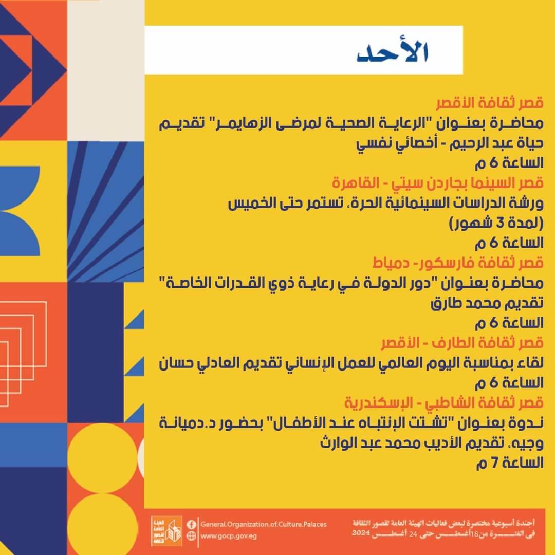 ضمن برامج وزارة الثقافة، وبرعاية الدكتور أحمد فؤاد هنو، وزير الثقافة، تقدم الهيئة العامة لقصور الثقافة، بإشراف الكاتب محمد عبد الحافظ ناصف، نائب رئيس الهيئة، أجندة حافلة بالفعاليات الفنية والأدبية، بدءا من اليوم الأحد وحتى السبت المقبل 24 أغسطس.