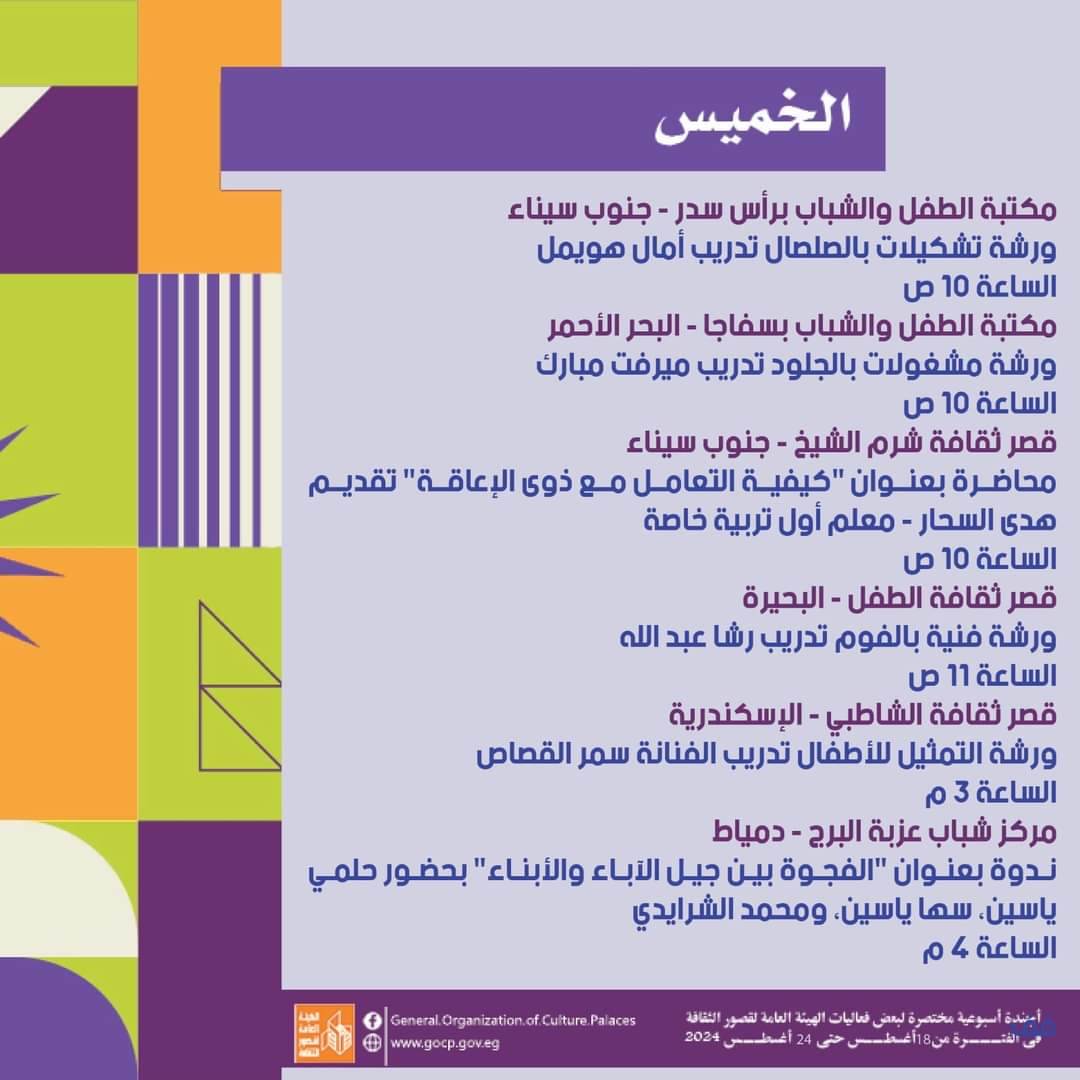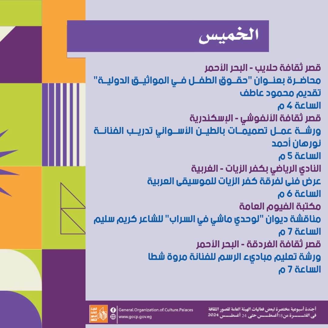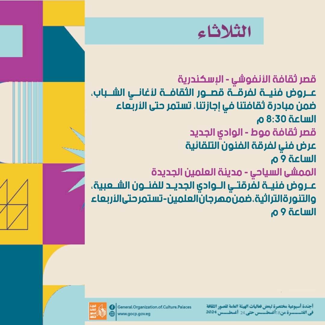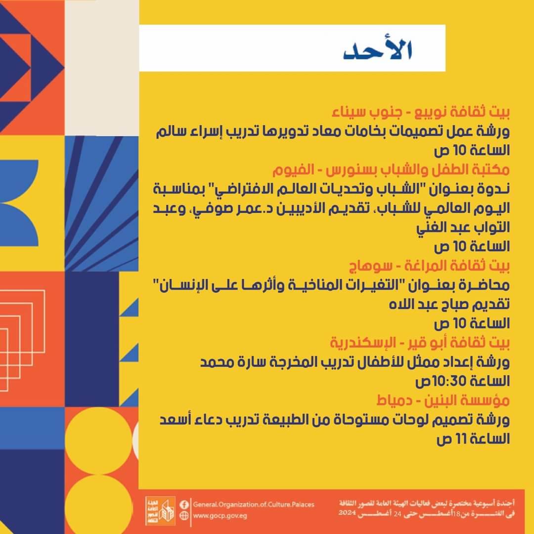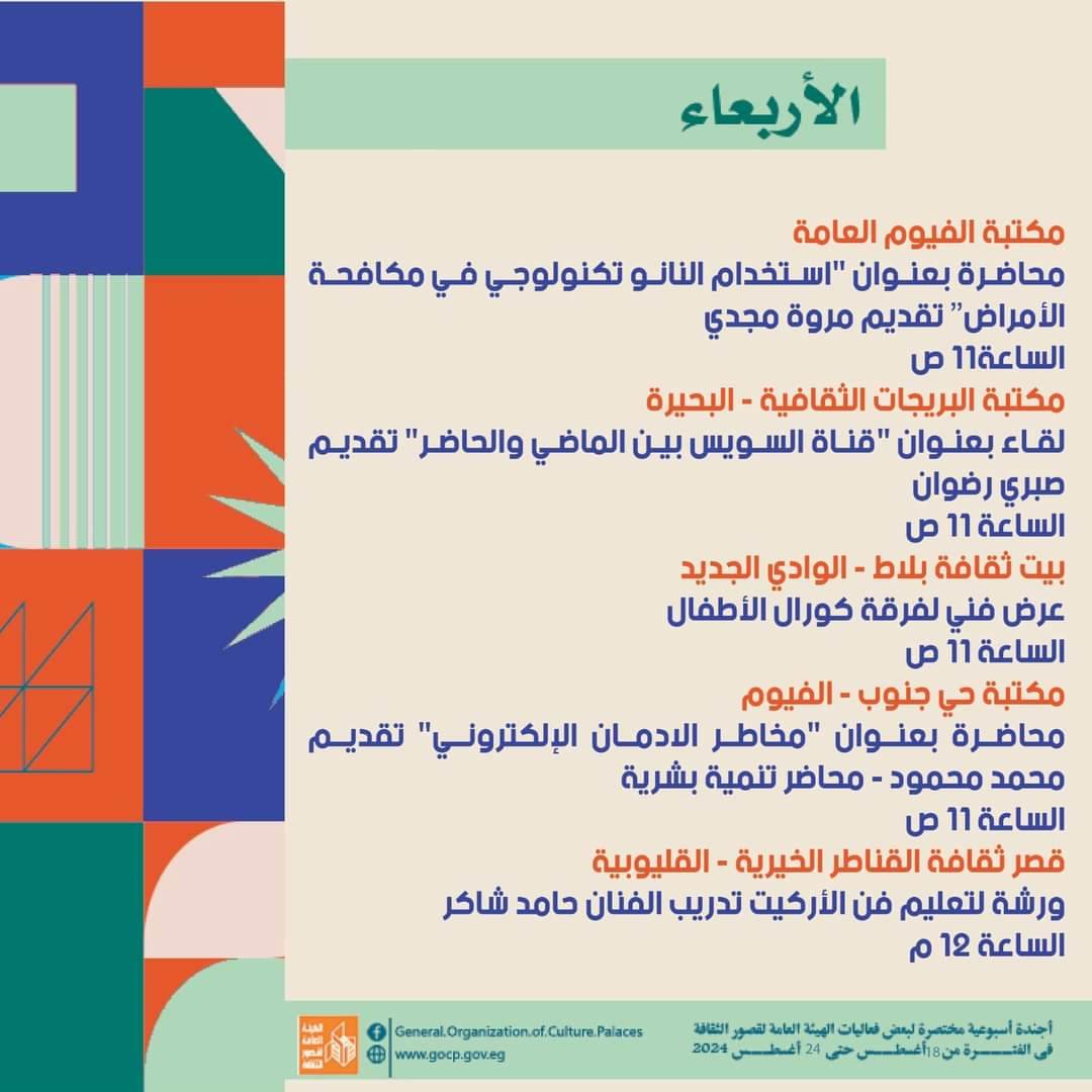 ضمن برامج وزارة الثقافة، وبرعاية الدكتور أحمد فؤاد هنو، وزير الثقافة، تقدم الهيئة العامة لقصور الثقافة، بإشراف الكاتب محمد عبد الحافظ ناصف، نائب رئيس الهيئة، أجندة حافلة بالفعاليات الفنية والأدبية، بدءا من اليوم الأحد وحتى السبت المقبل 24 أغسطس.