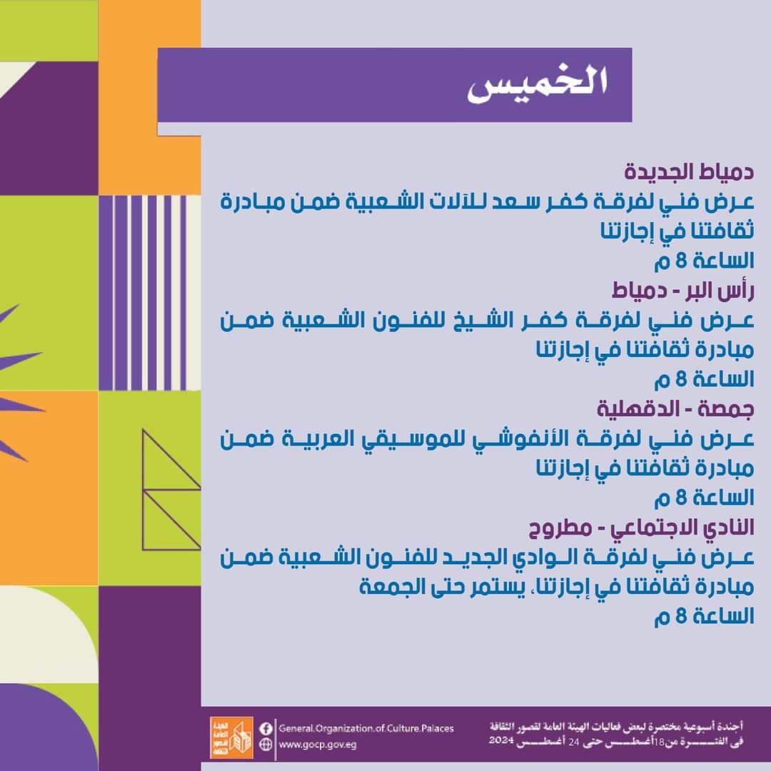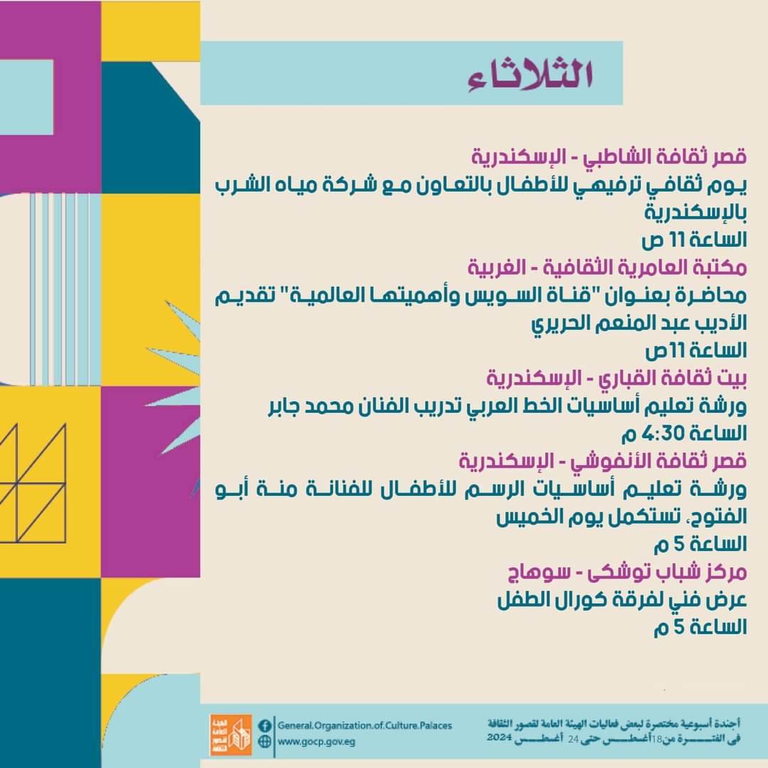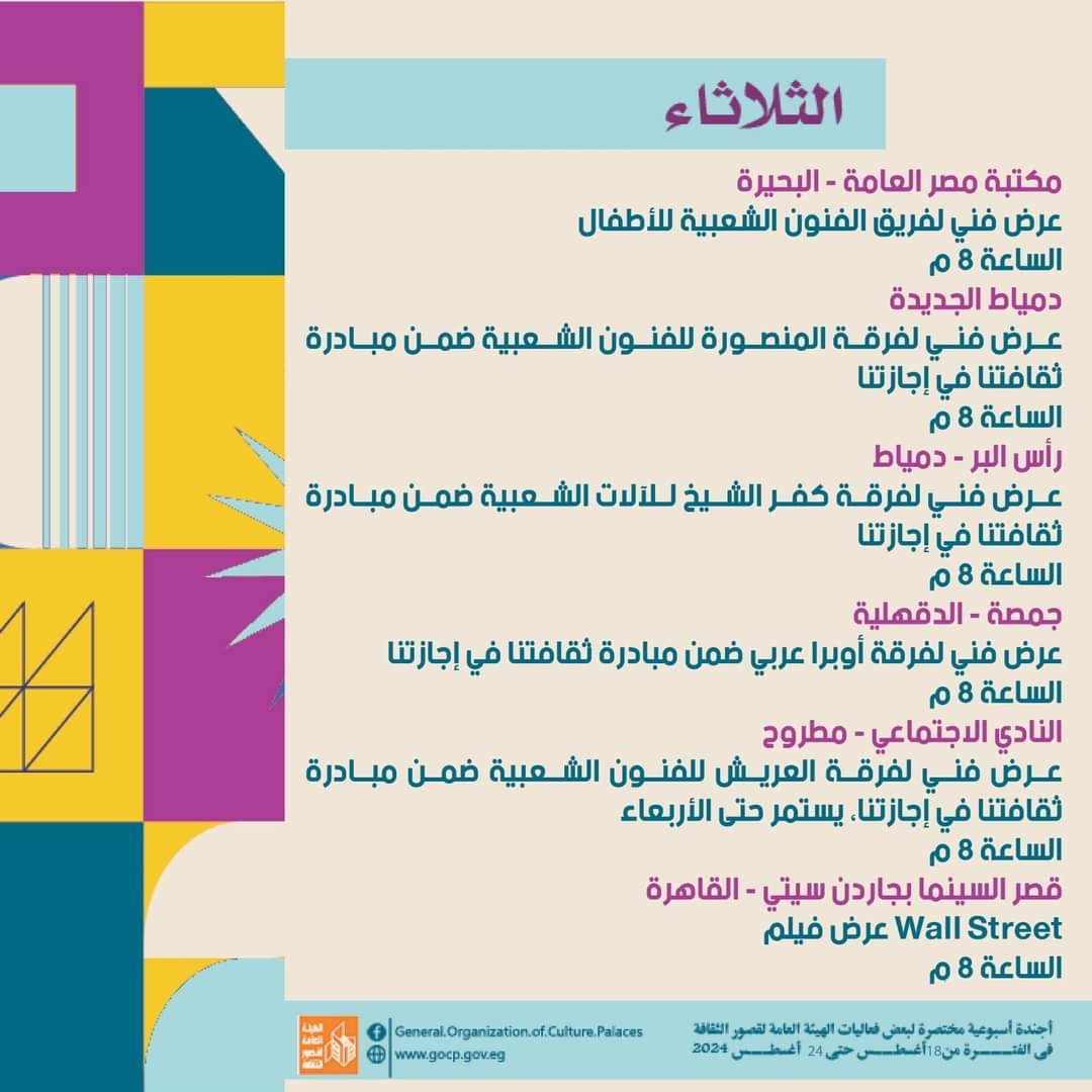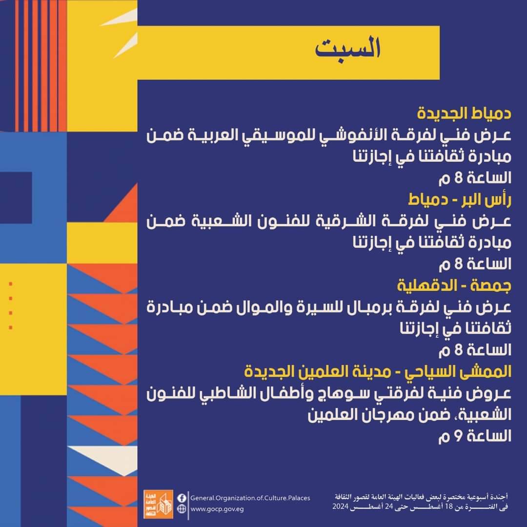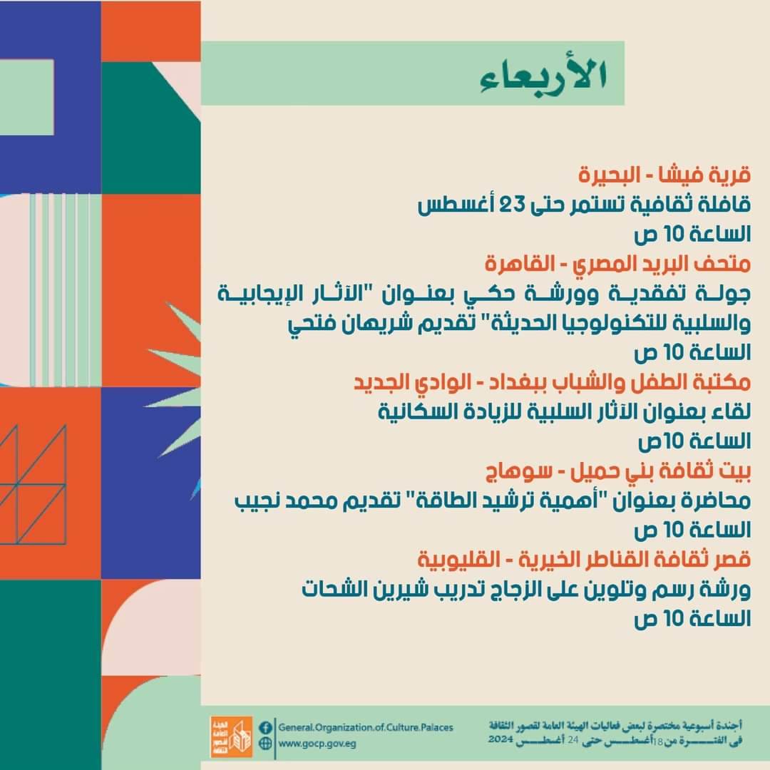 ضمن برامج وزارة الثقافة، وبرعاية الدكتور أحمد فؤاد هنو، وزير الثقافة، تقدم الهيئة العامة لقصور الثقافة، بإشراف الكاتب محمد عبد الحافظ ناصف، نائب رئيس الهيئة، أجندة حافلة بالفعاليات الفنية والأدبية، بدءا من اليوم الأحد وحتى السبت المقبل 24 أغسطس.