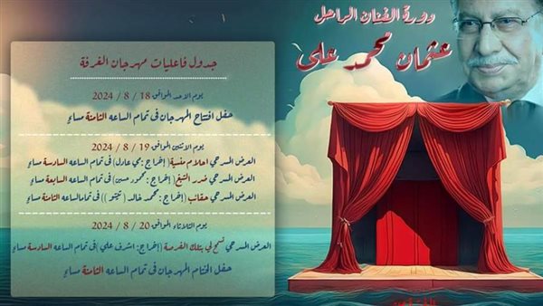 وتشهد مدينة الإسكندرية الليلة، حفل افتتاح فعاليات الدورة الثالثة من مهرجان مسرح الغرفة، وينطلق حفل الافتتاح علي مسرح قصر ثقافة الأنفوشي، في تمام الساعة الثامنة مساء، وسيتم خلال حفل الافتتاح، تكريم إسم الفنان الراحل عثمان محمد علي، وتتسلم التكريم ابنته الفنانة سلوي عثمان.
