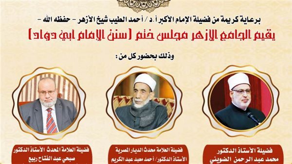 برعاية كريمة من فضيلة الإمام الأكبر فضيلة أ.د أحمد الطيب، شيخ الأزهر، يستعد الجامع الأزهر، الأربعاء القادم لعقد المجلس الختامي لقراءة كتاب "سنن أبي داود"، وذلك بحضور فضيلة أ.د. محمد الضويني، وكيل الأزهر، وفضيلة العلامة الجليل محدث الديار المصرية أ.د أحمد معبد عبد الكريم، عضو هيئة كبار العلماء، وفضيلة العلامة المحدث أ.د صبحي عبد الفتاح ربيع، أستاذ الحديث وعلومه بجامعة الأزهر.