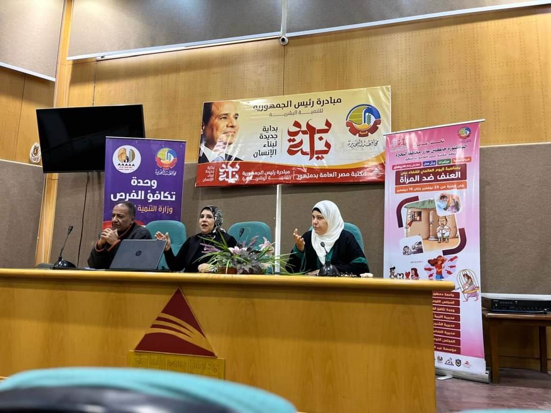 نظمت وحدة تكافؤ الفرص بمحافظة البحيرة بالتنسيق والتعاون مع مكتبة مصر العامة بدمنهور ندوة تثقيفية توعوية أقيمت بقاعة المؤتمرات بعنوان " التكلفة الاجتماعية للعنف ضد المرأة" تحت رعاية الدكتورة جاكلين عازر محافظ البحيرة، وبإشراف نجلاء محمد عباس البحقيرى مدير الوحدة وذلك ضمن مبادرة " بداية جديدة لبناء الانسان"، وفي إطار الاحتفال باليوم العالمي للقضاء على العنف ضد المرأة.