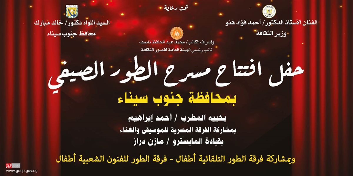 تقيم وزارة الثقافة، في السادسة مساء اليوم الأحد، احتفالية فنية بمناسبة افتتاح المسرح الصيفي بمدينة طور سيناء، تحت رعاية الدكتور أحمد فؤاد هنو، وزير الثقافة، واللواء خالد مبارك، محافظ جنوب سيناء، وتنظمها الهيئة العامة لقصور الثقافة، بإشراف الكاتب محمد ناصف، نائب رئيس الهيئة.