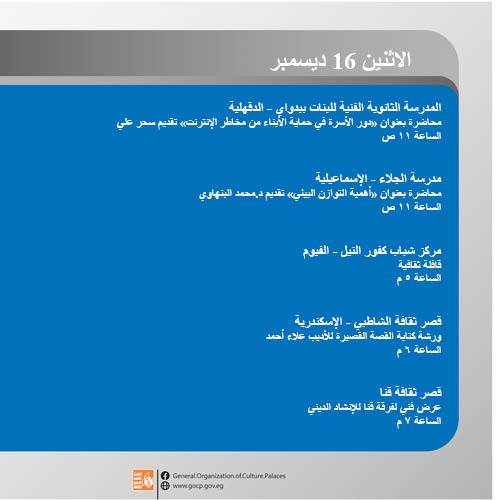 وتحفل الأجندة بمجموعة من اللقاءات المحاضرات واللقاءات التثقيفية والأدبية، والورش الفنية، هذا بالإضافة العروض المجانية بقصر السينما، الجولات التي ينظمها أتوبيس الفن الجميل للأطفال، والفعاليات المقامة بالمحافظات بمناسبة اليوم العالمي للغة العربية، ويوم ذوي الهمم، والعيد القومي لبورسعيد، وغيرها من الأنشطة التي تسهم في نشر الوعي الثقافي والفني وبناء الإنسان.