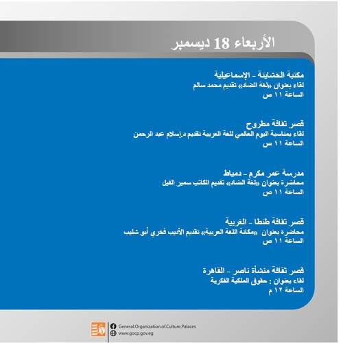 تواصل الهيئة العامة لقصور الثقافة تقديم فعالياتها الثقافية والفنية المتنوعة، ضمن برامج وزارة الثقافة، برعاية الدكتور أحمد فؤاد هنو، وزير الثقافة، وبإشراف الكاتب محمد ناصف، نائب رئيس الهيئة، وتشمل أجندة هذا الأسبوع، المستمرة حتى السبت 21 ديسمبر، أنشطة مميزة في مختلف المحافظات.