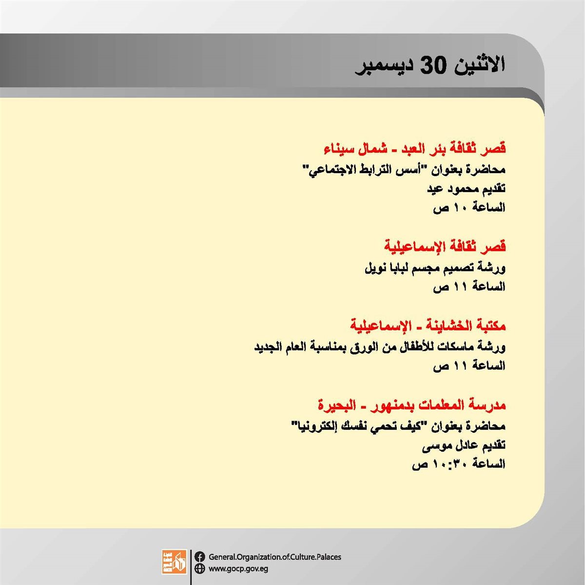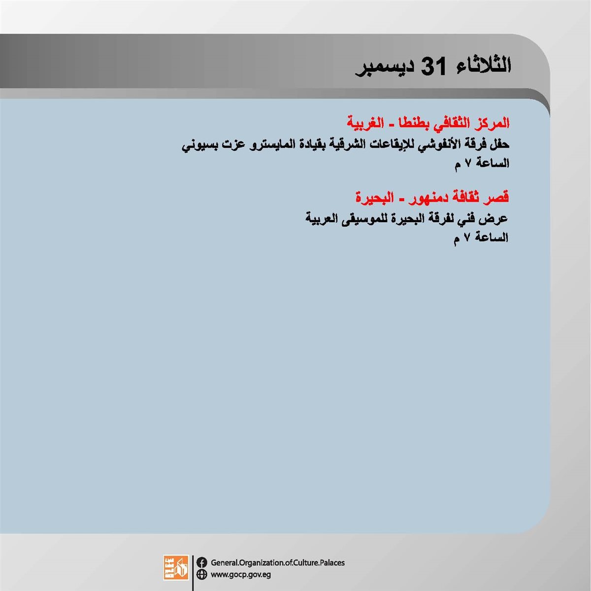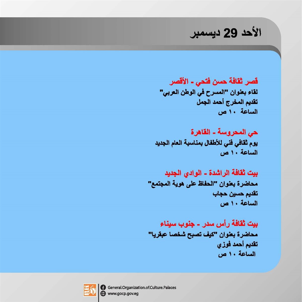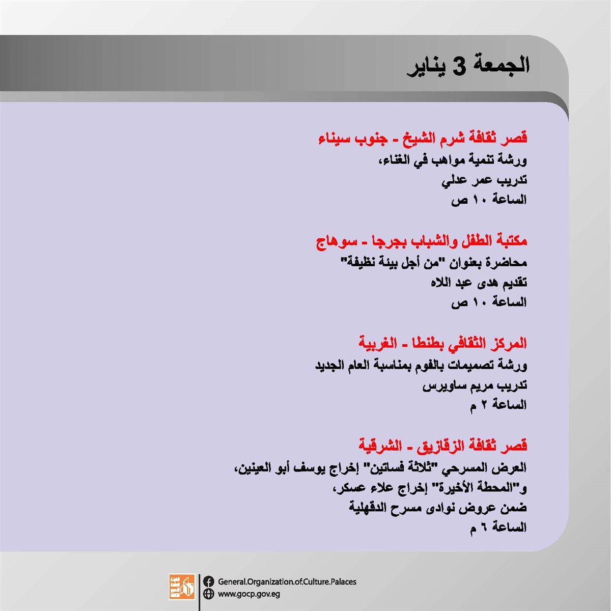 ضمن برامج وزارة الثقافة، وبرعاية الدكتور أحمد فؤاد هنو، وزير الثقافة، تقدم الهيئة العامة لقصور الثقافة، أجندة حافلة بالفعاليات الثقافية والفنية، بدءا من اليوم الأحد وحتى السبت المقبل 4 يناير، بإشراف الكاتب محمد ناصف، نائب رئيس الهيئة.