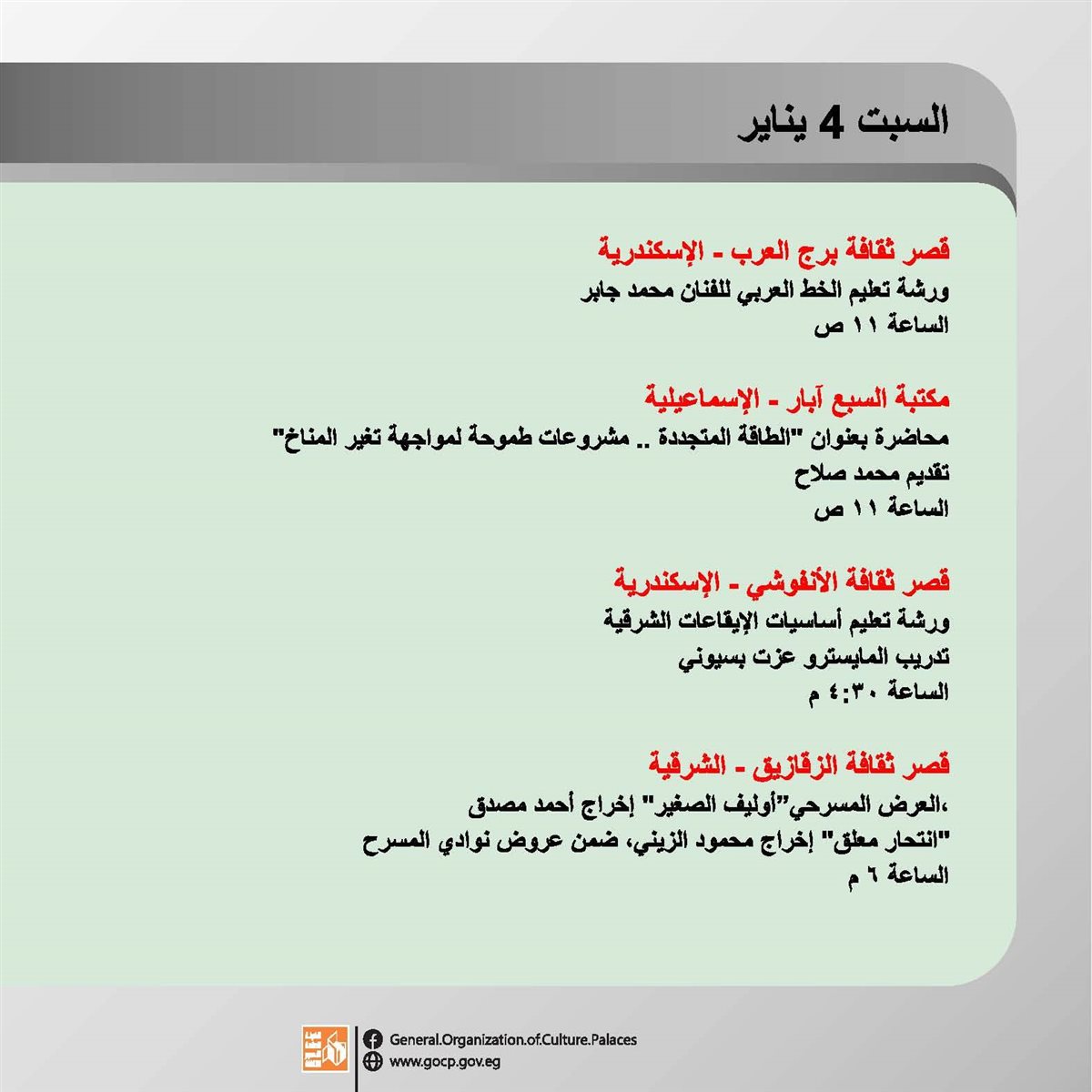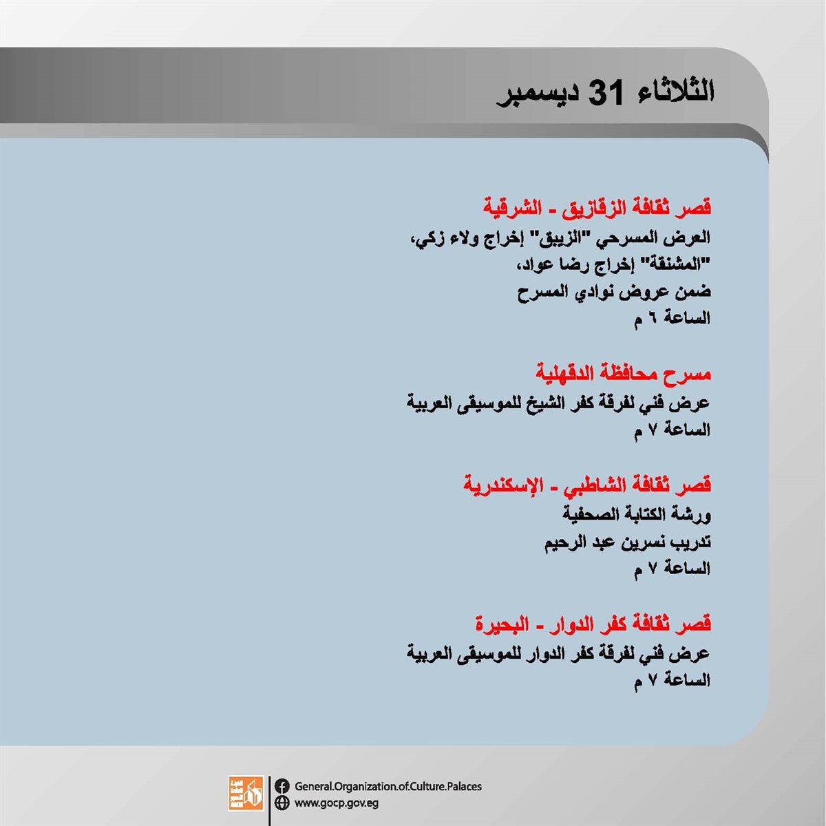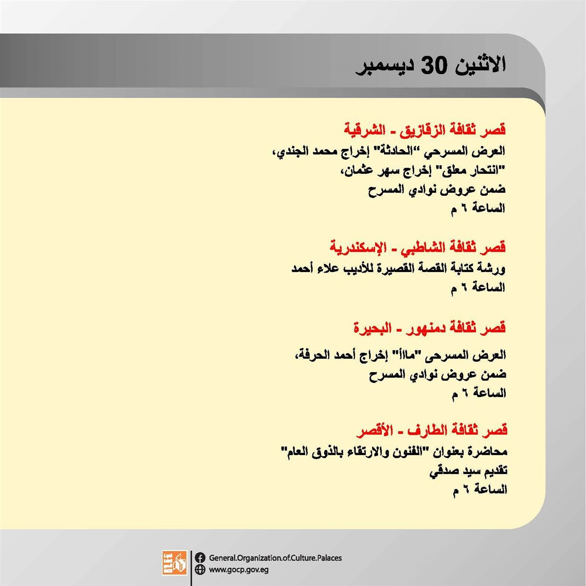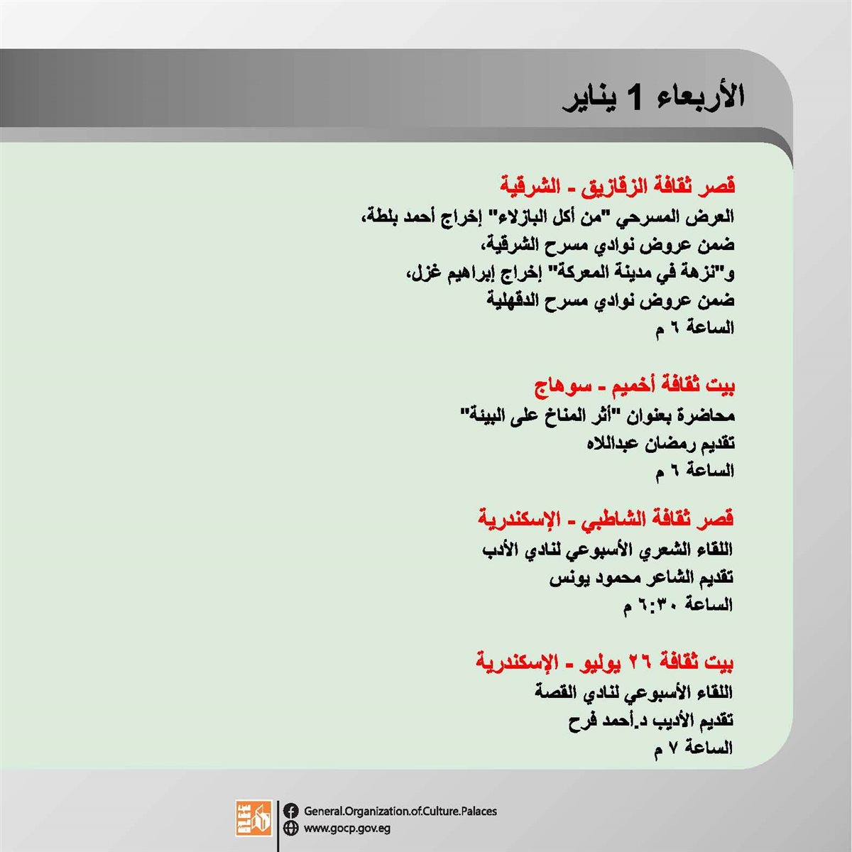 وتقدم العروض المسرحية بمحافظة الإسكندرية يوميا حتى ٧ يناير، على مسرح قصر ثقافة الأنفوشي، ويستقبل قصر ثقافة الزقازيق العروض المسرحية الخاصة بمحافظات إقليم شرق الدلتا الثقافي حتى ١٢ يناير.