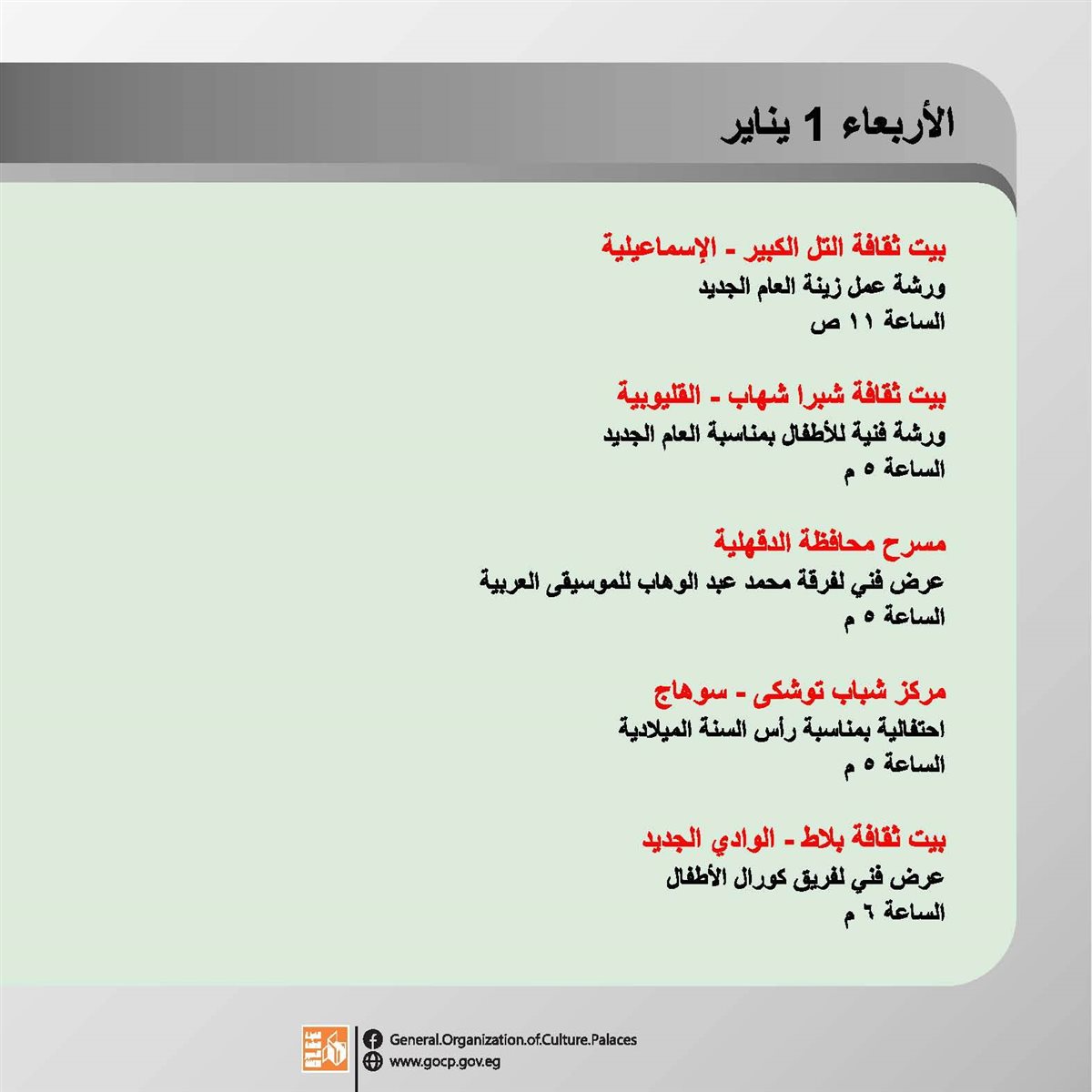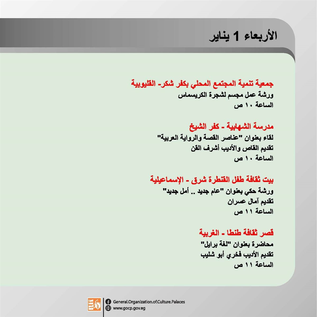 تستقبل الهيئة العامة لقصور الثقافة العام الجديد بباقة من الأنشطة الثقافية والفنية، تتنوع ما بين اللقاءات التثقيفية، العروض الفنية والفقرات الترفيهية والاستعراضية بجانب ورش الحكي، والمشغولات اليدوية.