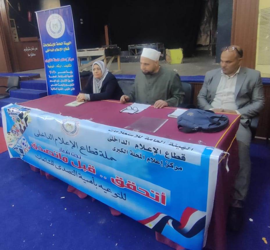 نظم مركز إعلام المحلة الكبرى فى محافظة الغربية، ندوة توعوية بعنوان " الشائعات وكيفية التصدي لها من منظور ديني "، بمقر مركز شباب مدينة سمنود ،وذلك فى إطار حملة (إتحقق ...قبل ما تصدق ) التي أطلقها قطاع الإعلام الداخلى بالهيئه العامه للاستعلامات وبتوجيهات من د.أحمد يحيي رئيس القطاع، وأدارتها سماح جميل الإعلامية بمركز إعلام المحلة الكبرى تحت إشراف محمود السمرى مدير مركز إعلام المحلة.