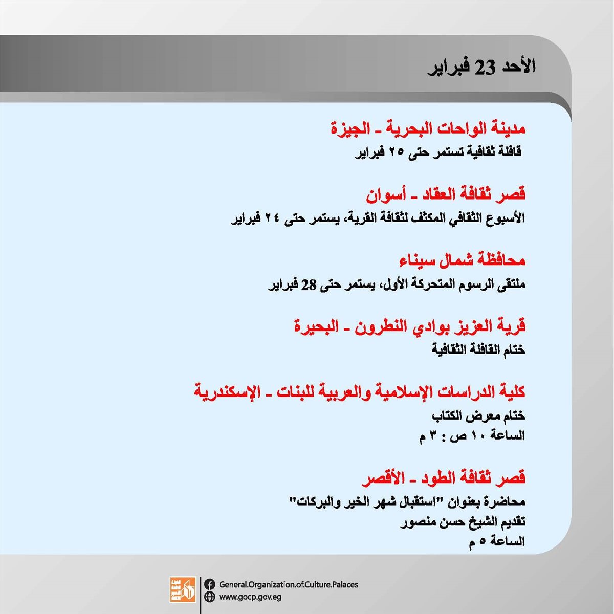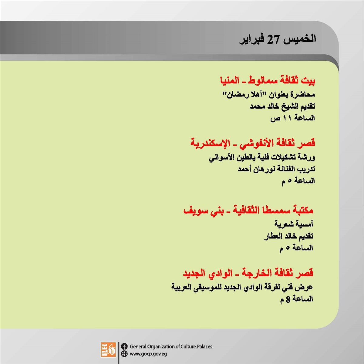 هذا وتحفل الأجندة بباقة متنوعة من اللقاءات التثقيفية والتوعوية، هذا بالإضافة الورش الفنية والحرفية، وعروض الموسيقى العربية والإنشاد الديني، والفعاليات المقامة استعدادا لاستقبال شهر رمضان الكريم.