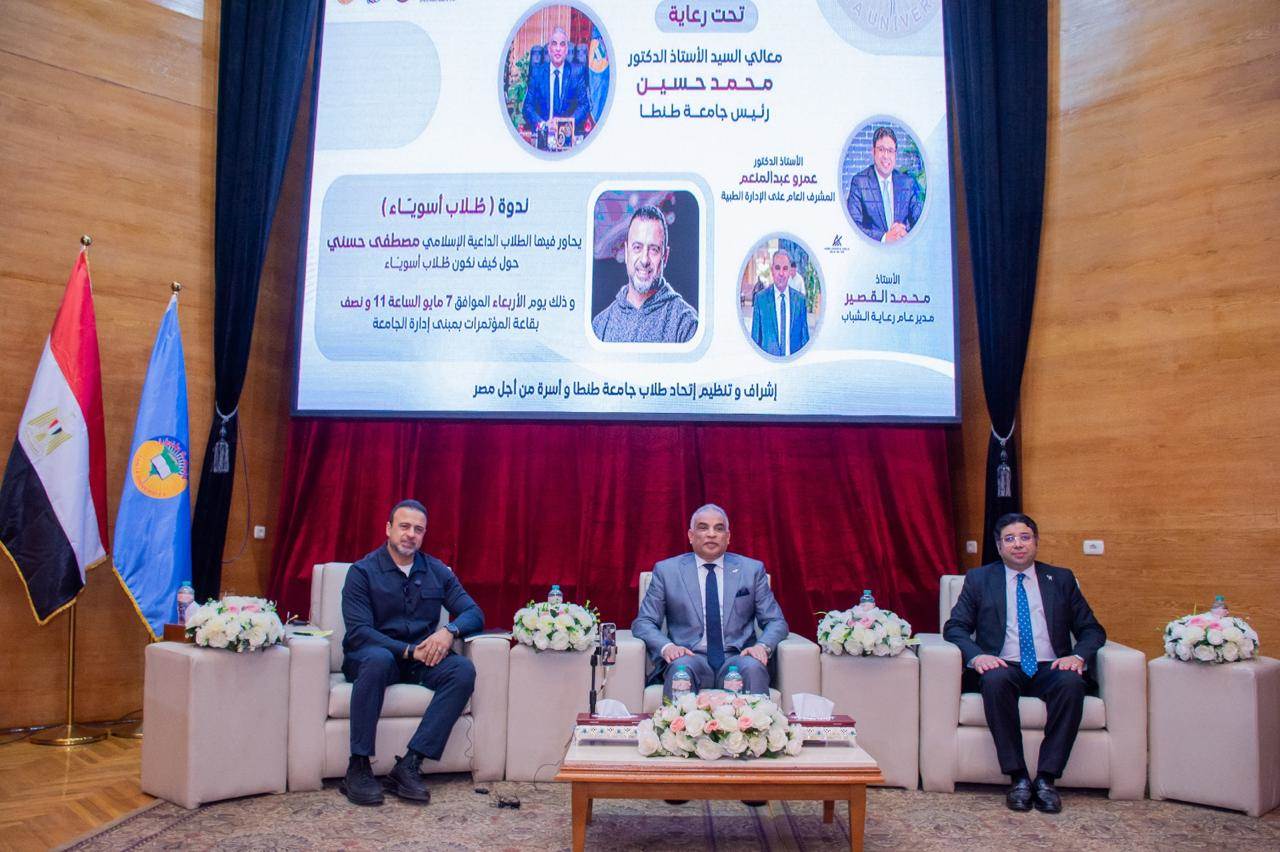نظمت جامعة طنطا ندوة" طلاب أسوياء"، بحضور الدكتور محمد حسين رئيس جامعة طنطا، والدكتور حاتم أمين نائب رئيس جامعة طنطا لشؤون الدراسات العليا والبحوث، وعدد من عمداء ووكلاء الكلية، والدكتور عمرو عبد المنعم المشرف العام على الإدارة الطبية، والدكتور خلود مطر المستشار الثقافي لدولة البحرين، ومحمد القصير مدير عام الإدارة العامة لرعاية الطلاب بالجامعة، وعدد كبير من طلاب وطالبات الجامعة، وحاور بالندوة الداعية الإسلامي مصطفي حسنى.