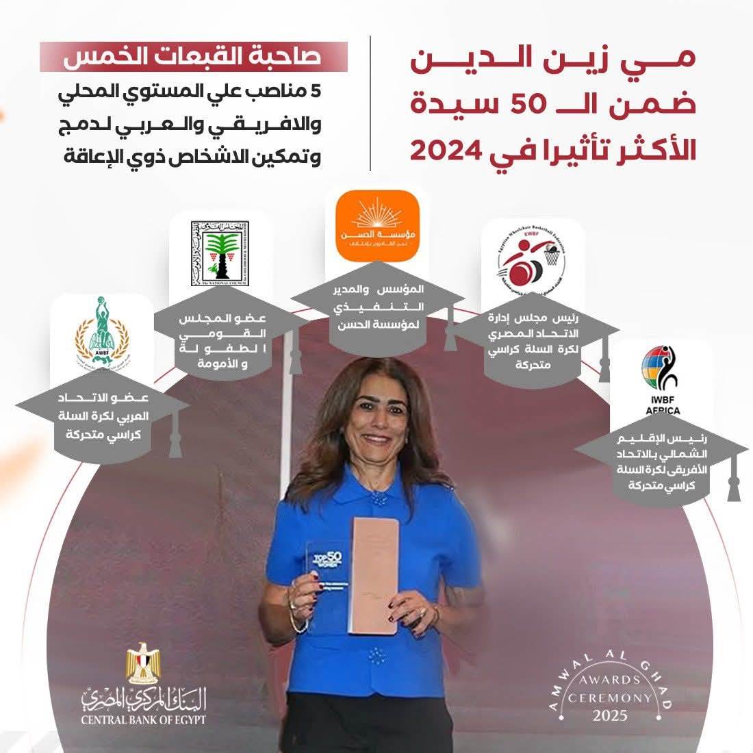 وجهت مي زين الدين رئيس اتحاد كرة السلة للكراسي المتحركة، رئيس الإقليم الشمالي بالاتحاد الأفريقي لكرة السلة للكراسي المتحركة ،عضو مجلس إدارة الاتحاد العربي لكرة السلة للكراسي المتحركة ،عضو المجلس القومى للطفولة والأمومة، و المؤسس والمدير التنفيذي لمؤسسة الحسن لدمج القادرون باختلاف"، شكرها وتقديرها لكل أفراد متحدى الاعاقة وأسرة الرياضة البارالمبية ،بمناسبة أختيارها ضمن القائمة السنوية لأقوى 50 سيدة تأثيرًا فى مصر لعام 2024.