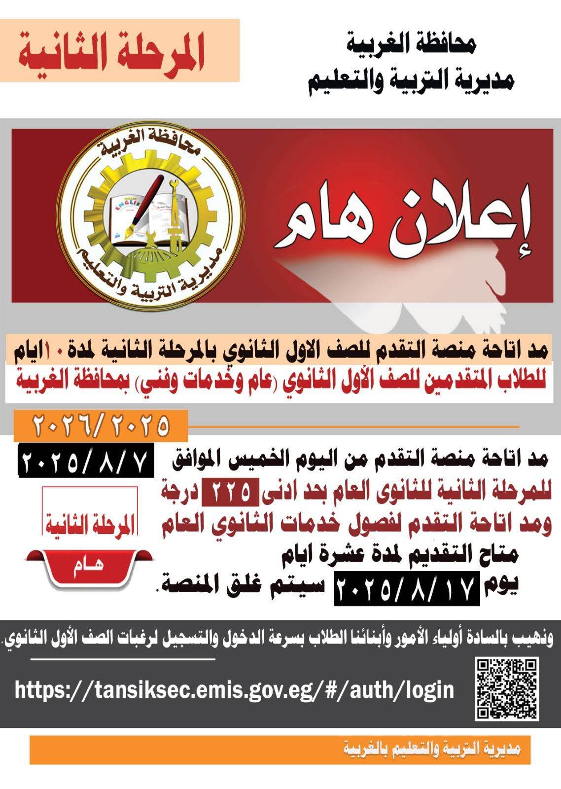 وأكد اللواء أشرف الجندي محافظ الغربية، أن هذا القرار يأتي استجابة لمطالب أولياء الأمور، وإتاحة فرصة إضافية للطلاب الذين لم يتمكنوا من التسجيل، موضحًا أن المرحلة الثانية تشمل التقديم للثانوي العام للطلاب الحاصلين على مجموع لا يقل عن 225 درجة، وكذلك فصول الخدمات، والتعليم الفني.