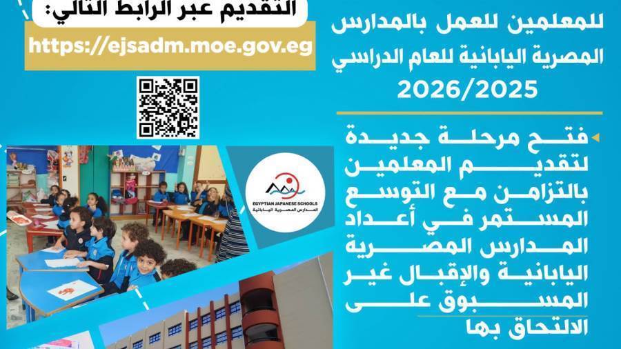 في ضوء النجاحات الملموسة التي حققتها المدارس المصرية اليابانية بمختلف محافظات الجمهورية، والإقبال المتزايد من أولياء الأمور على إلحاق أبنائهم بها، تعلن وزارة التربية والتعليم والتعليم الفني عن فتح باب التقديم للمعلمين للانضمام لفريق العمل بالمدارس المصرية اليابانية، وذلك ابتداءً من اليوم الخميس ١٤ أغسطس ٢٠٢٥ ولمدة 15 يوما، وذلك عبر الموقع الإلكتروني: