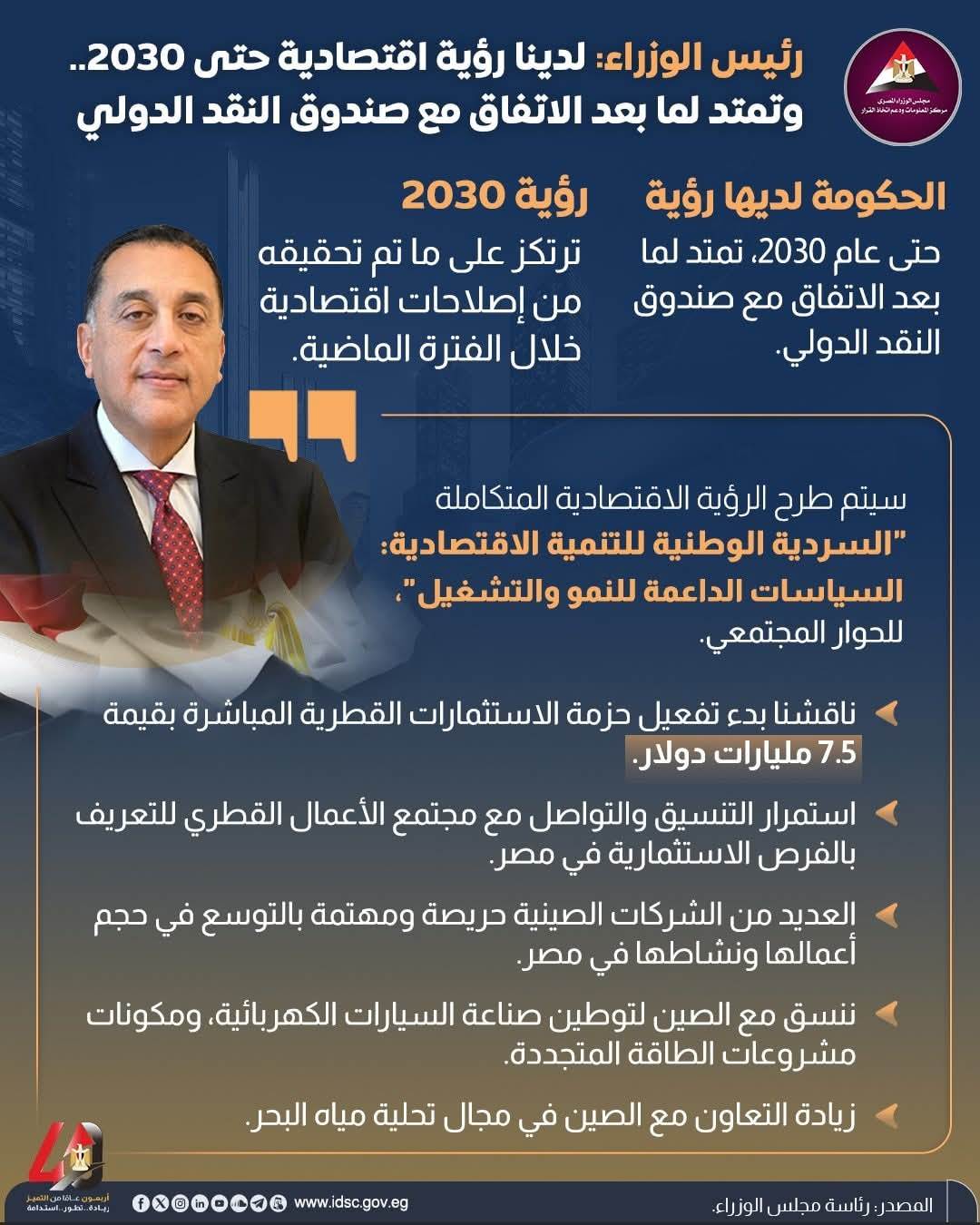 يذكر أن الدكتور مصطفى مدبولي، رئيس مجلس الوزراء، كان قد كشف أن الحكومة لديها رؤية اقتصادية حتى عام 2030 تمتد لما بعد الاتفاق مع صندوق النقد الدولي، معلنًا بدء تفعيل حزمة الاستثمارات القطرية المباشرة التي تقدر بقيمة 7.5 مليارات دولار.