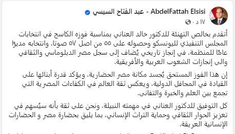 تقدم الرئيس عبد الفتاح السيسي بخالص التهنئة للدكتور خالد العناني بمناسبة فوزه الكاسح في انتخابات المجلس التنفيذي لليونسكو وحصوله على ٥٥ من اصل ٥٧ صوتا، وانتخابه مديرًا عامًا للمنظمة، في إنجاز تاريخي يُضاف إلى سجل مصر الدبلوماسي والثقافي والى إنجازات الشعوب العربية والأفريقية.