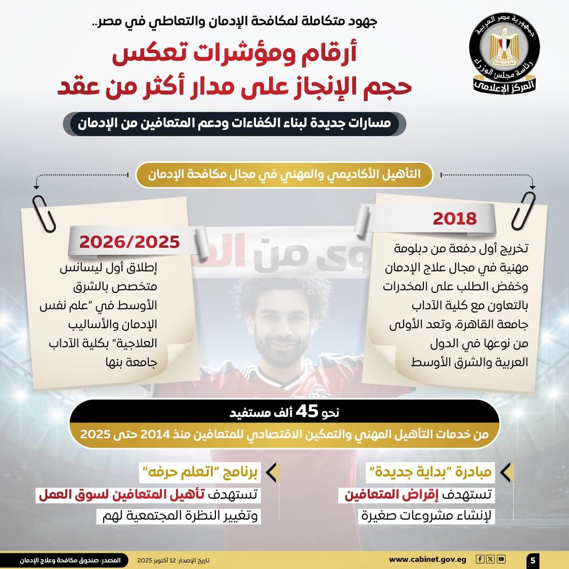نشر المركز الإعلامي لمجلس الوزراء عددًا من الإنفوجرافات عبر منصاته على مواقع التواصل الاجتماعي، سلط من خلالها الضوء على جهود الدولة المتكاملة لمكافحة الإدمان والتعاطي في مصر، بالإضافة إلى حجم الإنجاز الذي تعكسه الأرقام والمؤشرات على مدار أكثر من عقد.