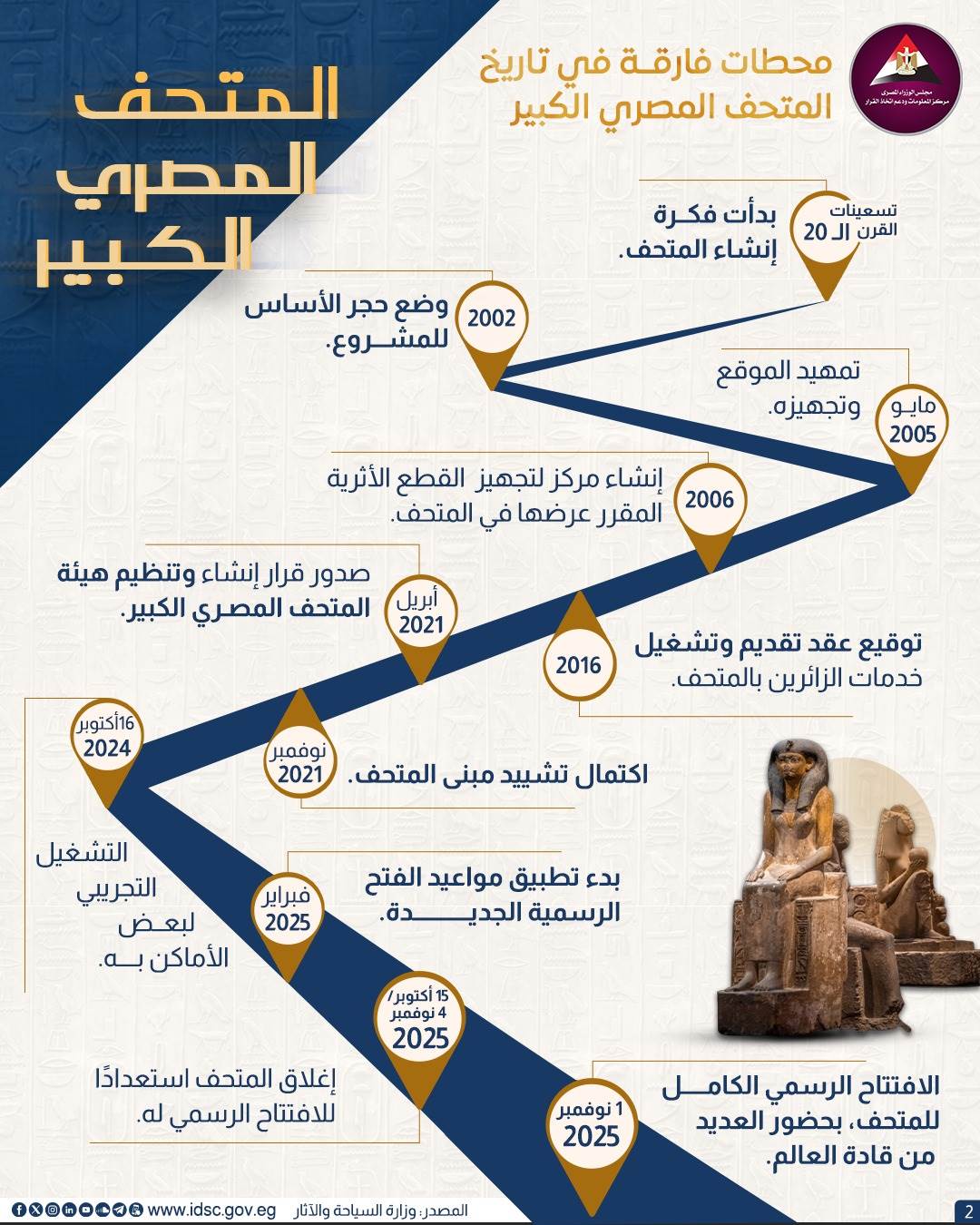 وذكرت الانفوجرافات التي أظهرت محطات فارقة في تاريخ المتحف المصري الكبير، أن فكرة إنشاء المتحف تعود إلى سبعينيات القرن العشرين، وفي عام 2002، تم وضع حجر الأساس للمشروع، إيذانًا بانطلاق رحلة طويلة من العمل والتخطيط.