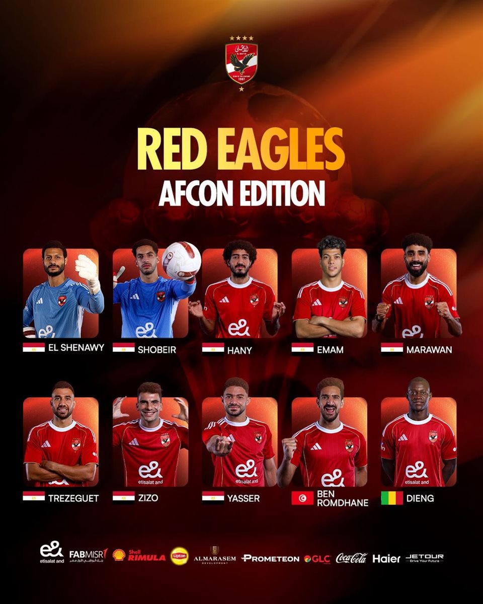 نشرت الصفحة الرسمية للنادي الأهلي على موقع التواصل الاجتماعي فيسبوك صورة تجمع لاعبي الفريق الأول لكرة القدم المنضمين لمنتخبات بلادهم للمشاركة في بطولة كأس أمم إفريقيا 2025، تحت عنوان " النسور الحمراء في واجب دولي في المغرب".