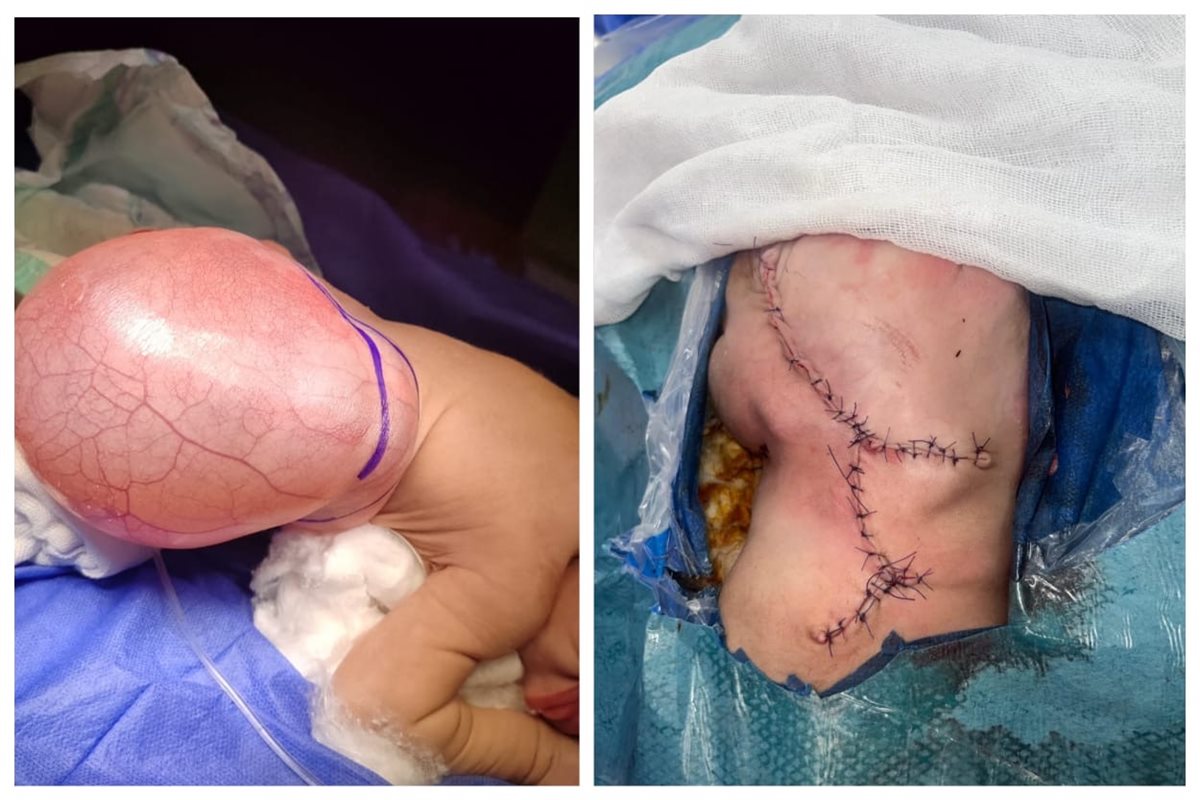 كان مستشفى الأطفال برئاسة الأستاذ الدكتور ياسر فاروق، مدير المستشفى، قد استقبل رضيعا يبلغ من العمر شهرين، ويعاني من وجود كيس سحائي بمنطقة الظهر، وتم وضعه بالرعاية المركزة، وإجراء عددا من الفحوصات الطبية، حتى تم تحويله بعد ذلك إلى مستشفى الأمراض العصبية والنفسية وجراحة المخ والأعصاب، برئاسة الأستاذ الدكتور طارق راجح، وبمناظرة نتائج أشعة الرنين المغناطيسي على الفقرات القطنية العجزية للطفل، تبين وجود كيس سحائي بارز، بالإضافة إلى عيوب خلقية مركبة شملت، خروج المثانة، فتق إربي، وخلع في مفصل الحوض.