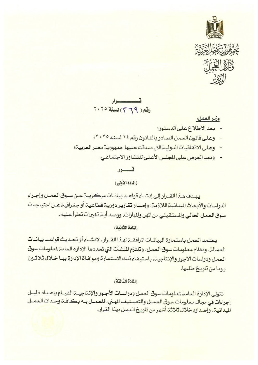 أصدر وزير العمل السيد/ محمد جبران، القرار الوزاري رقم (269) لسنة 2025، بشأن إنشاء وتحديث قواعد بيانات سوق العمل، بعد الاطلاع على الدستور، وقانون العمل رقم 14 لسنة 2025، والاتفاقيات الدولية ذات الصلة، وبعد العرض على المجلس الأعلى للتشاور الاجتماعي.