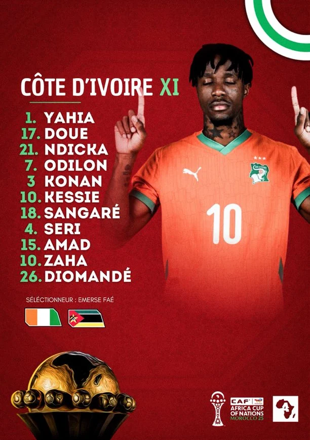 أعلن إيميرس فاي، المدير الفني كوت ديفوار تشكيل منتخب الأفيال ضد موزمبيق مساء اليوم الأربعاء، في إطار منافسات مسابقة كأس أمم أفريقيا 2025.