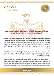 وتعرب جمهورية مصر العربية في هذا السياق، عن تقديرها البالغ لحكمة القيادتين السعودية والإماراتية، في التعامل البناء مع تطورات الأوضاع في اليمن، والحرص على تحقيق الاستقرار في اليمن، والحفاظ على سيادته، ومصالح شعبه الشقيق.