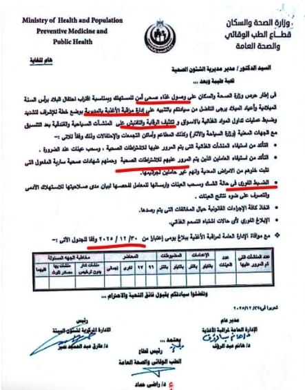 وأشادت النقابة بتوجيهات وزارة الصحة لمديري مديريات الشئون الصحية بالمحافظات، والتي تضمنت فحص سلامة الأغذية، وسحب عينات عند الاشتباه، والتأكد من حمل العاملين شهادات صحية سارية تثبت خلوهم من الأمراض المعدية، إلى جانب اتخاذ الإجراءات القانونية الفورية حيال المخالفين، بما في ذلك الغلق والإعدام عند الضرورة، فضلًا عن الإبلاغ الفوري عن حالات الاشتباه في التسمم الغذائي، وموافاة الجهات المختصة بتقارير يومية بدءًا من 30 ديسمبر 2025، وحتى انتهاء الاحتفالات.