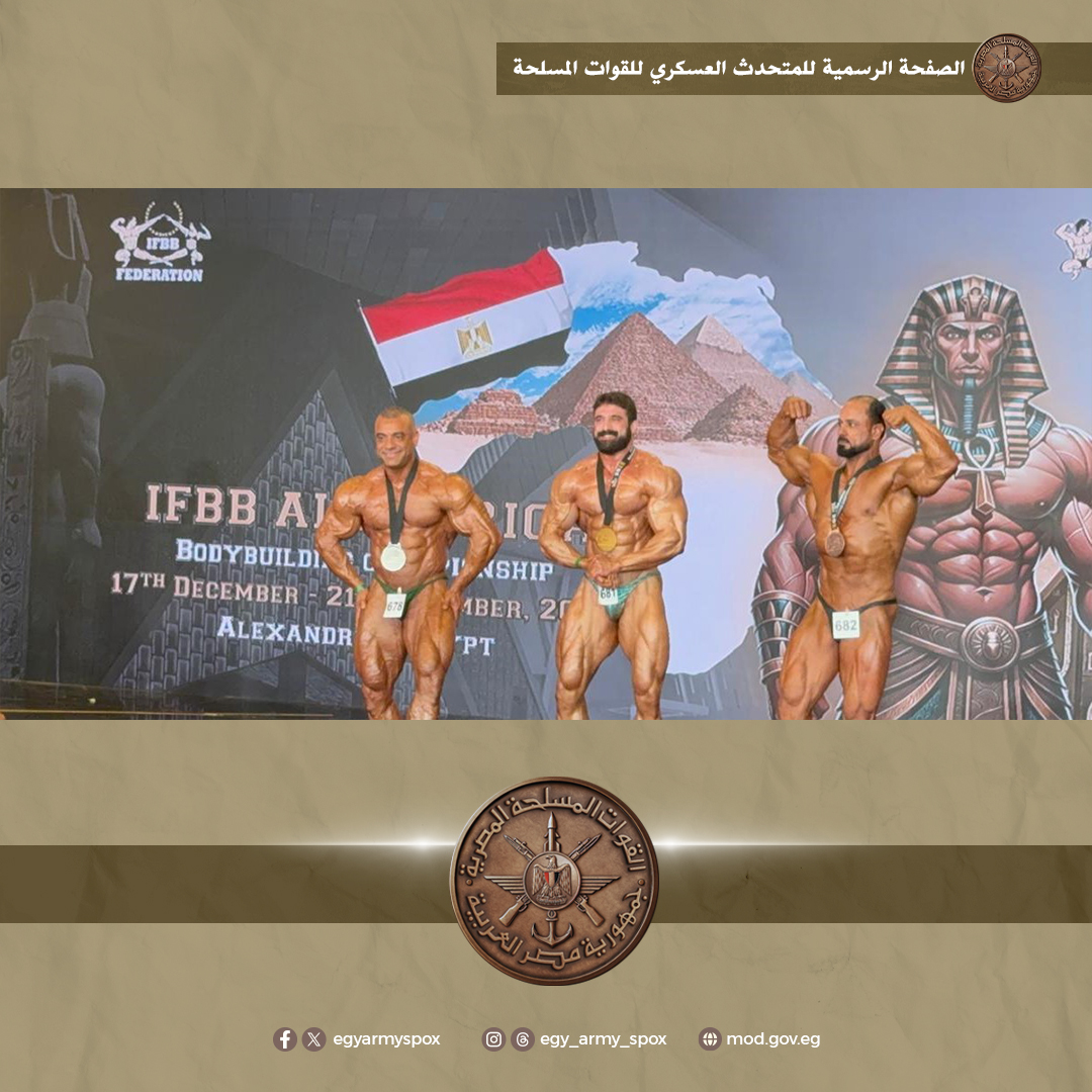 وخلال فعاليات بطولة إفريقيا لكمال الأجسام التي أقيمت بجمهورية مصر العربية؛ نجح فريق القوات المسلحة المشارك بالبطولة والذى تشرف على تدريبه قيادة قوات الصاعقة فى تحقيق عدد من الميداليات المتنوعة.. حيث حقق كل من الرائد محمد صبرى محمد فاروق الميدالية الذهبية في وزن 75 كيلو، والمساعد أول عماد محمود أحمد المنيلاوي الميدالية الفضية في وزن 100 كيلو، والمساعد كريم عبد المنعم عبد الفتاح الميدالية الفضية في وزن 90 كيلو، والرقيب أحمد سامى السيد أحمد الميدالية الفضية في وزن 65 كيلو، والرقيب أول بدر رجب عبد الباقى الميدالية البرونزية فى وزن 80 كيلو، وتمكن الرائد ياسين محمد فتحى من تحقيق المركز الخامس فى وزن 95 كيلو.