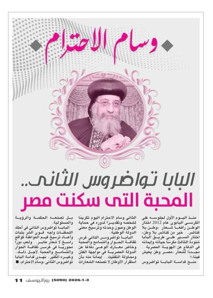 من جانبه، أعرب قداسة البابا تواضروس الثاني عن شكره وتقديره لمؤسسة «روزاليوسف»، مشيدًا بدورها التاريخي والإعلامي في دعم قضايا الوطن، ونشر الوعي، والدفاع عن قيم التنوير والانتماء الوطني، مؤكدًا أهمية الإعلام المسؤول في بناء المجتمعات وتعزيز التماسك المجتمعي.