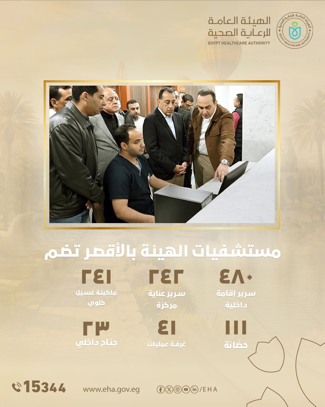 وأضاف أن مستشفيات الهيئة بالمحافظة تضم 480 سرير إقامة داخلية، و242 سرير عناية مركزة، و111 حضّانة، و241 ماكينة غسيل كلوي، و41 غرفة عمليات، و23 جناحًا داخليًا، بما يدعم الجاهزية والاستجابة للاحتياجات الطبية المختلفة.