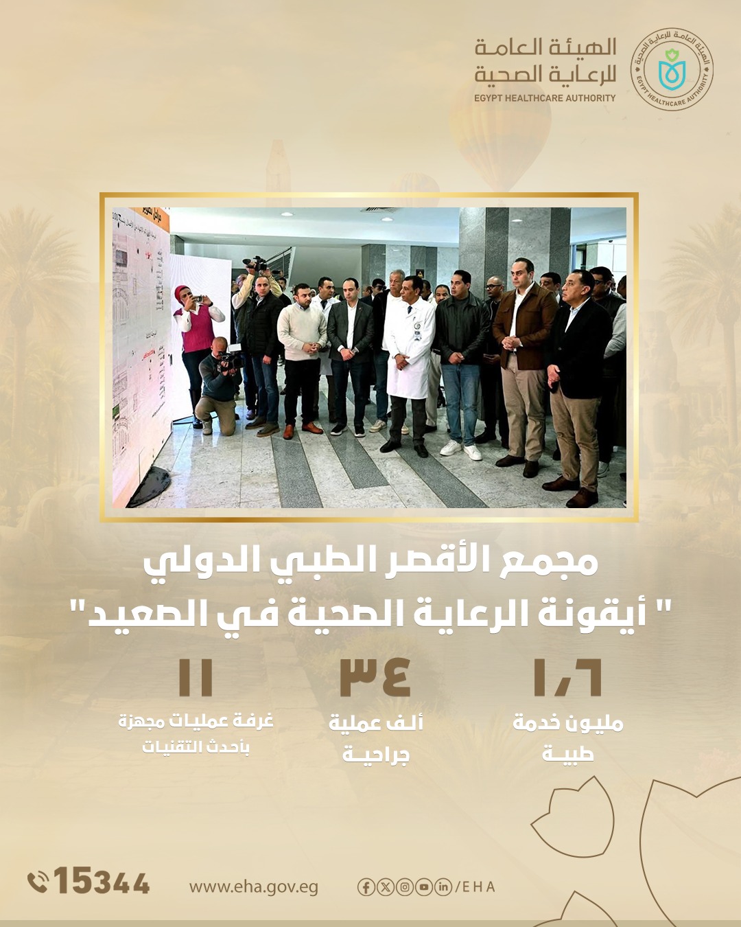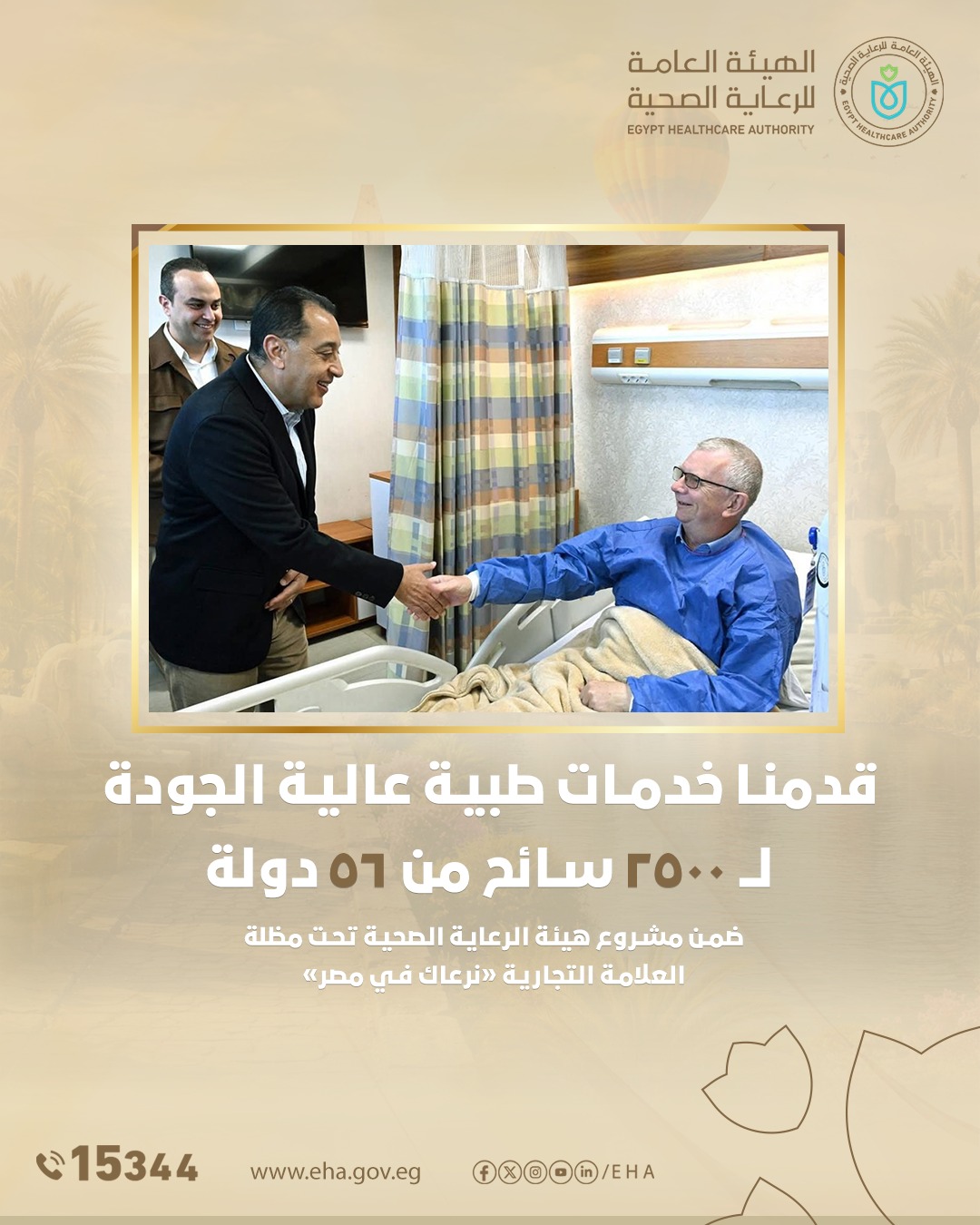 كما أبرز الإنفوجراف دور الهيئة في دعم السياحة العلاجية، حيث تم تقديم خدمات طبية عالية الجودة لـ2500 سائح من 56 دولة تحت مظلة العلامة التجارية «نرعاك في مصر»، فضلًا عن الدور المحوري لـ مجمع الأقصر الطبي الدولي باعتباره أيقونة الرعاية الصحية في الصعيد، بعد تقديمه 1.6 مليون خدمة طبية، وإجراء أكثر من 34 ألف عملية جراحية داخل 11 غرفة عمليات مجهزة بأحدث التقنيات.