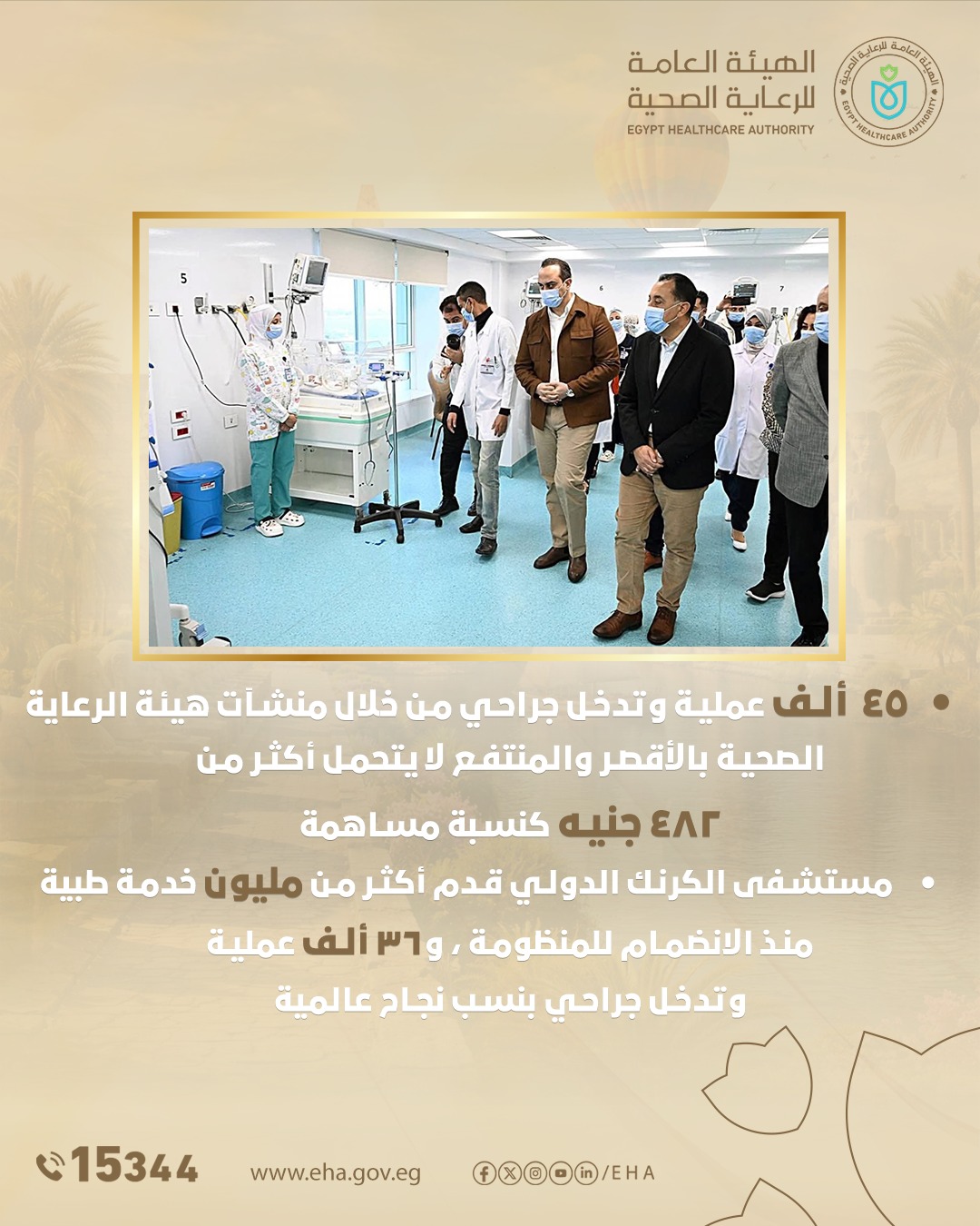 وأشار الإنفوجراف إلى تنفيذ 45 ألف عملية وتدخل جراحي داخل منشآت هيئة الرعاية الصحية بالأقصر، مؤكدًا أن المنتفع لا يتحمل أكثر من 482 جنيهًا فقط كنسبة مساهمة، في إطار التزام المنظومة بالحماية المالية للمواطن.