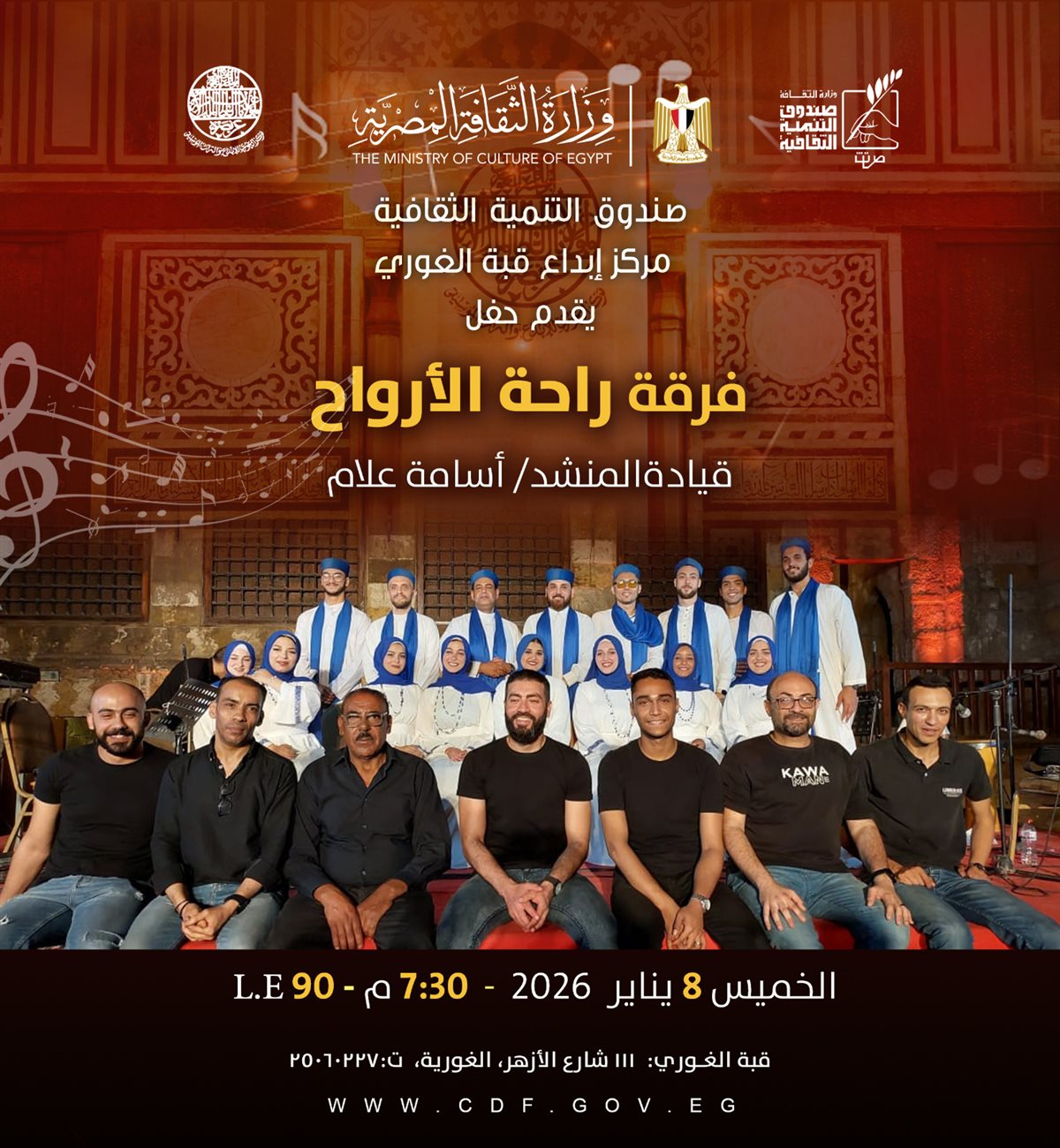 ضمن دعم الفنون الجادة وصون التراث الموسيقي والروحي، يقدّم قطاع صندوق التنمية الثقافية بوزارة الثقافة، من خلال مركز إبداع قبة الغوري بشارع الازهر، حفلًا فنيًا لفرقة راحة الأرواح، وذلك مساء الخميس 8 يناير 2026 في تمام الساعة السابعة والنصف مساءً.