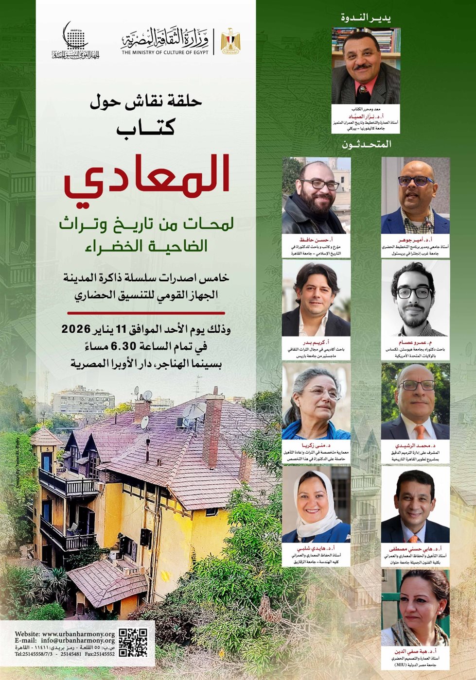 يعقد الجهاز القومي للتنسيق الحضاري، برئاسة المهندس محمد أبوسعدة، ندوة لمناقشة كتاب «المعادي.. لمحات من تاريخ وتراث الضاحية الخضراء»، خامس إصدارات سلسلة «ذاكرة المدينة»، وذلك في السادسة والنصف مساء الأحد المقبل 11 يناير 2026، بقاعة سينما الهناجر بدار الأوبرا.