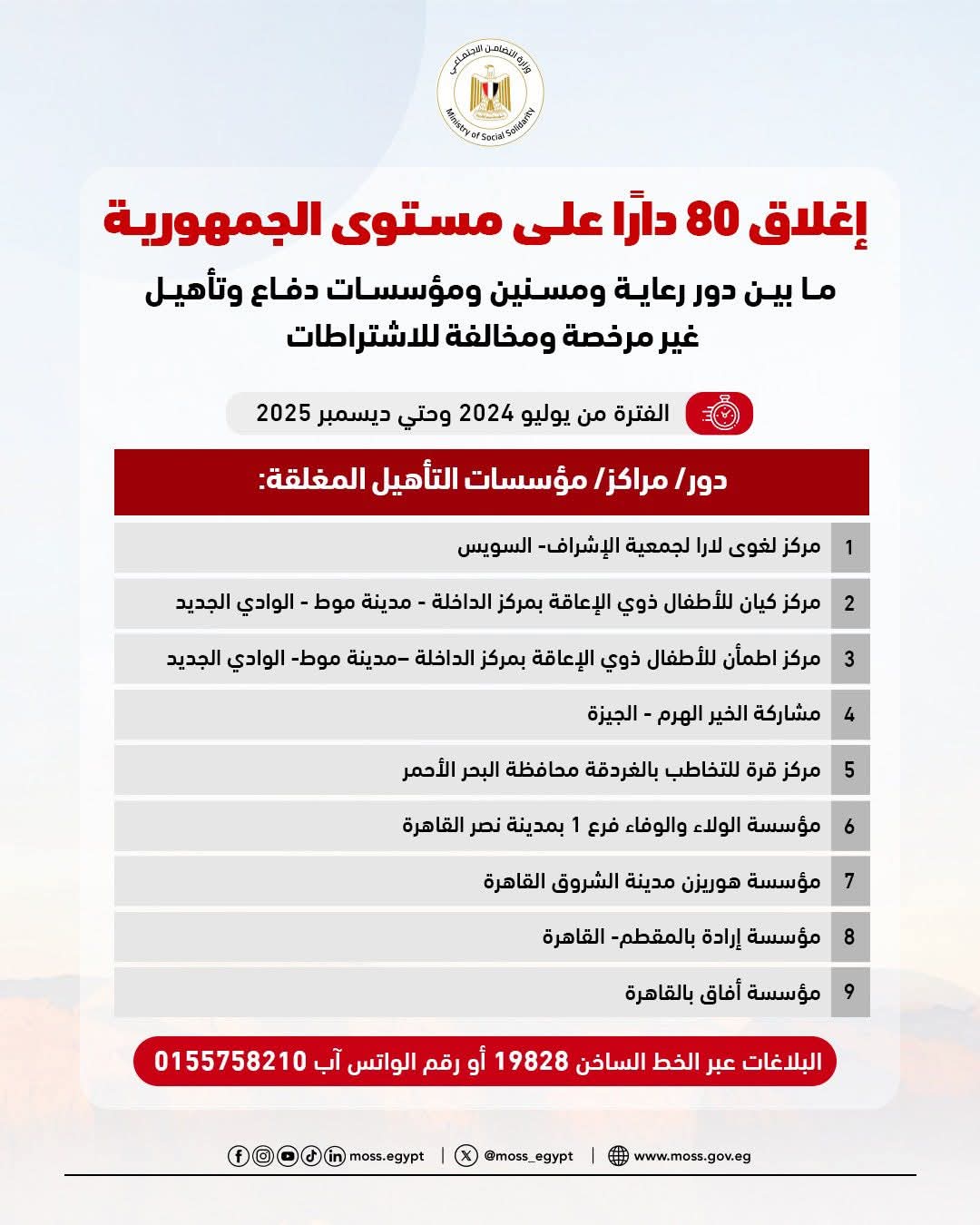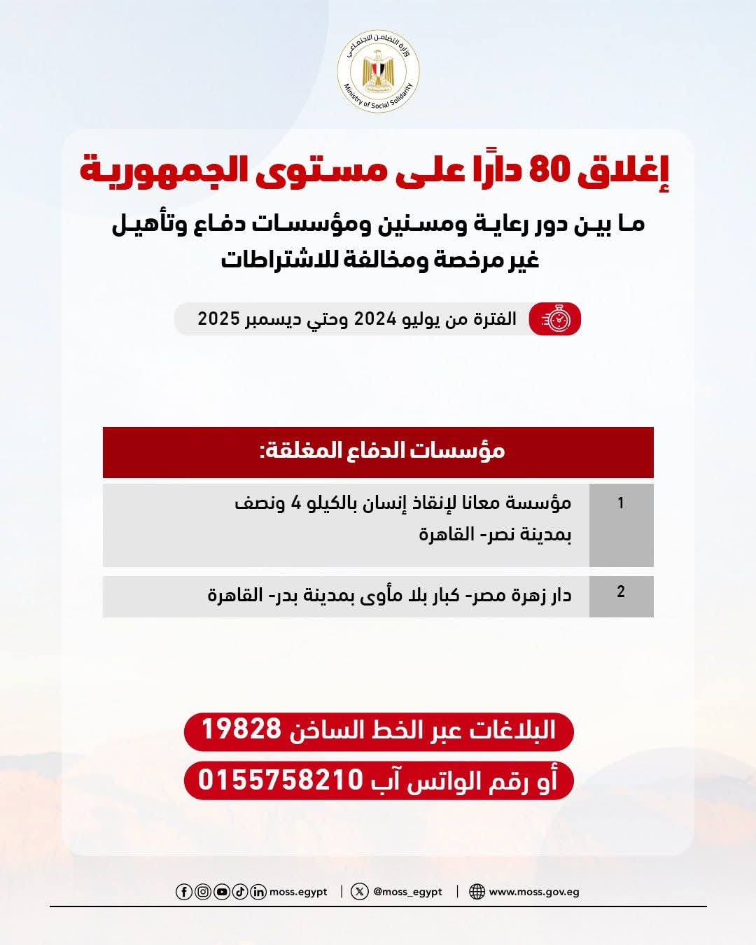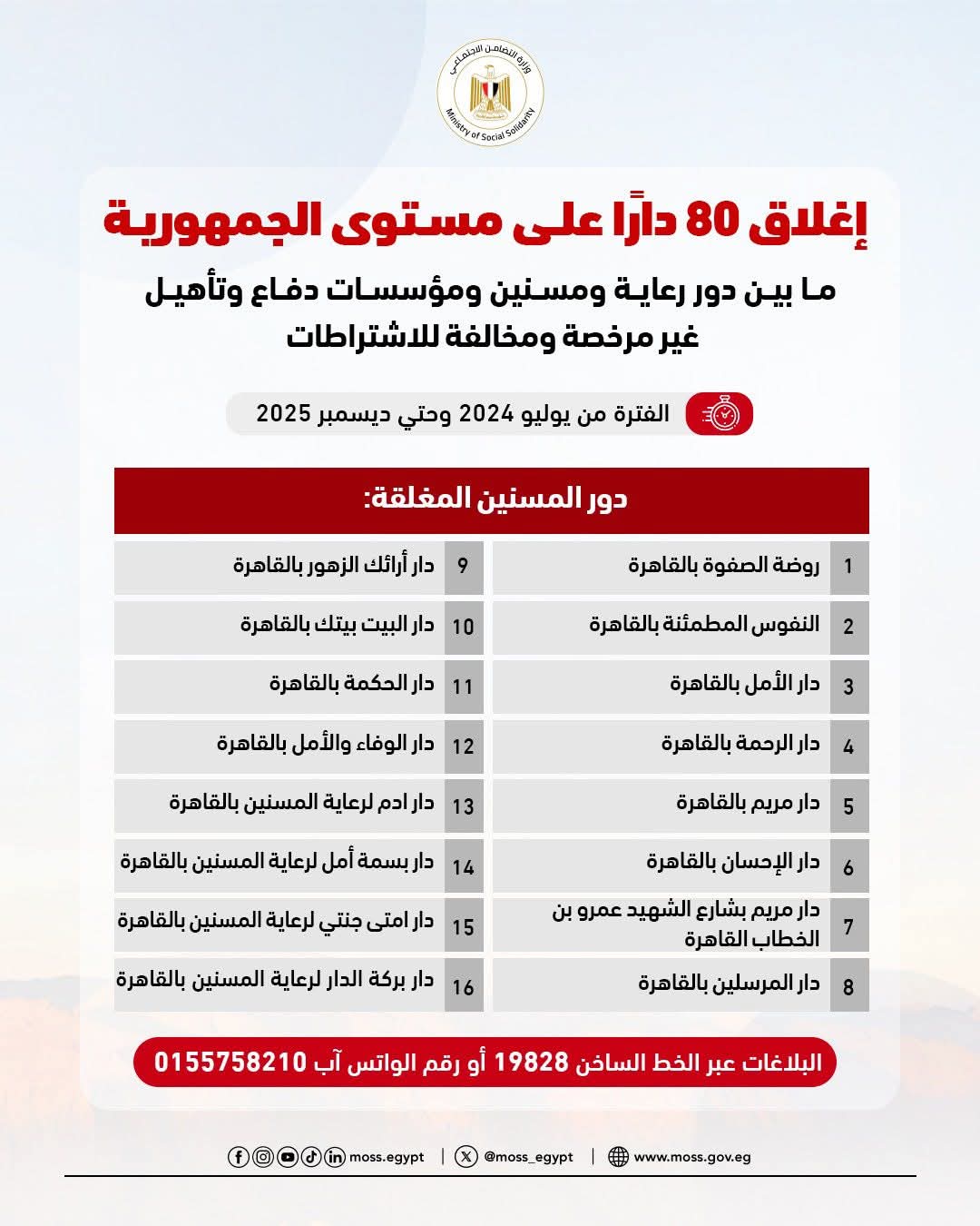 أعلنت وزارة التضامن الاجتماعي عن إغلاق 80 دارًا على مستوى الجمهورية، ما بين دور رعاية ومسنين ومؤسسات دفاع وتأهيل، لكونها غير مرخصة ومخالفة للاشتراطات خلال الفترة من يوليو 2024 وحتي ديسمبر 2025.