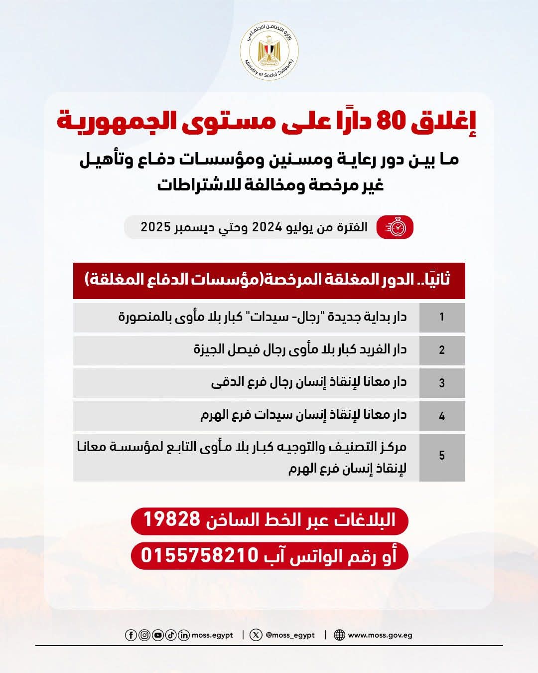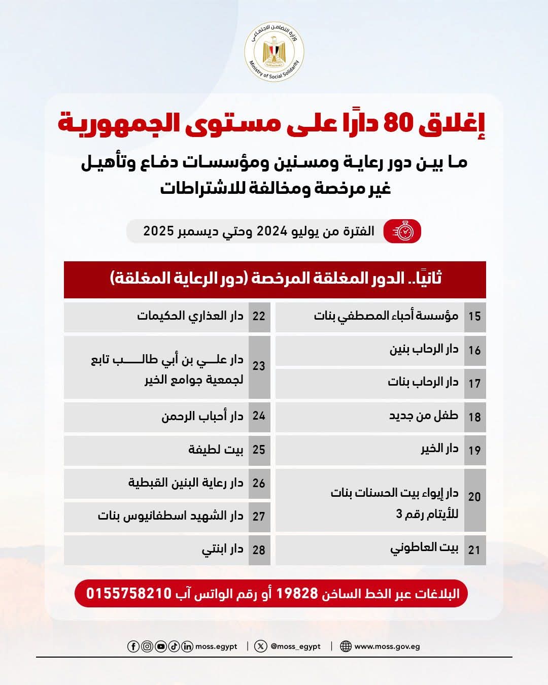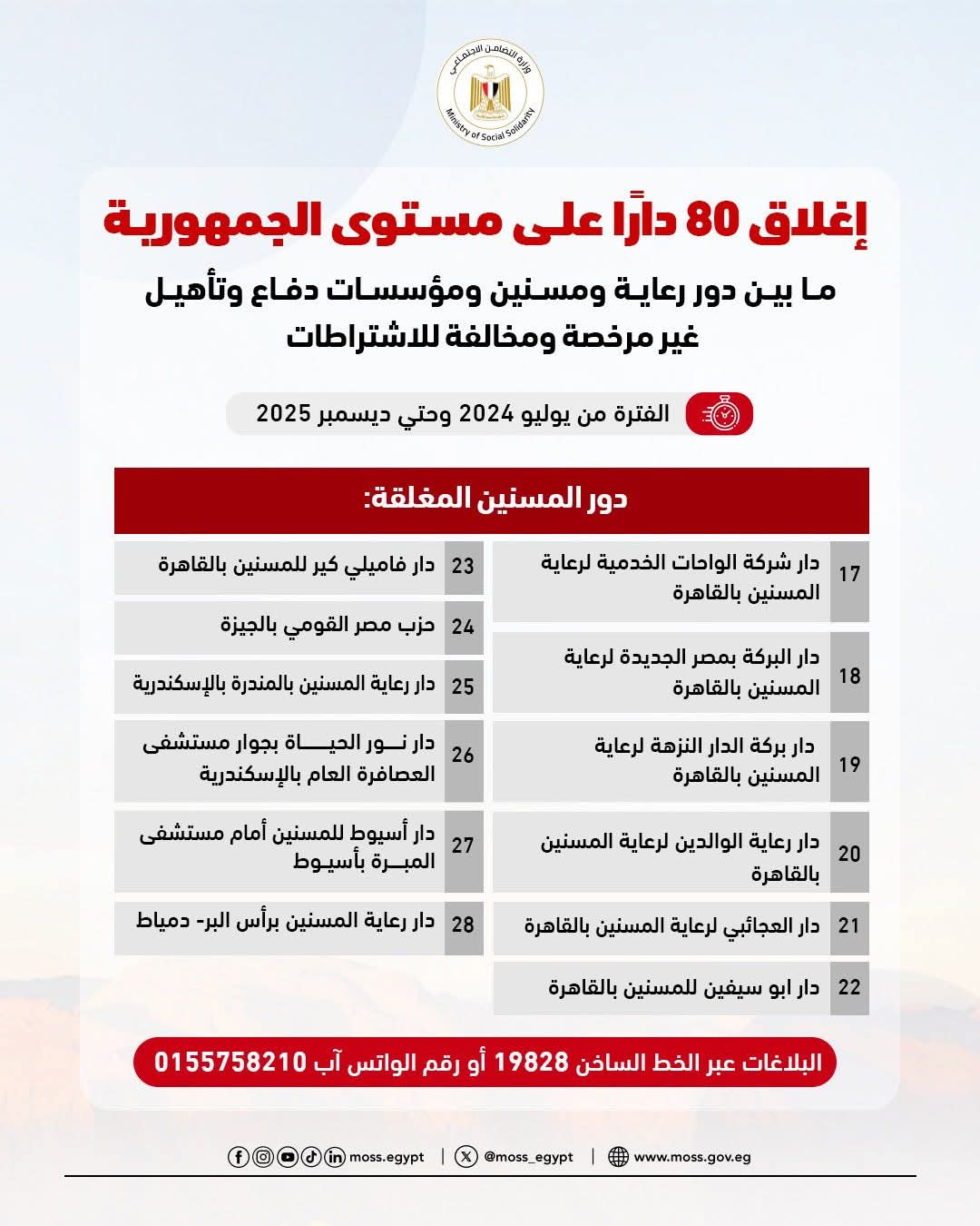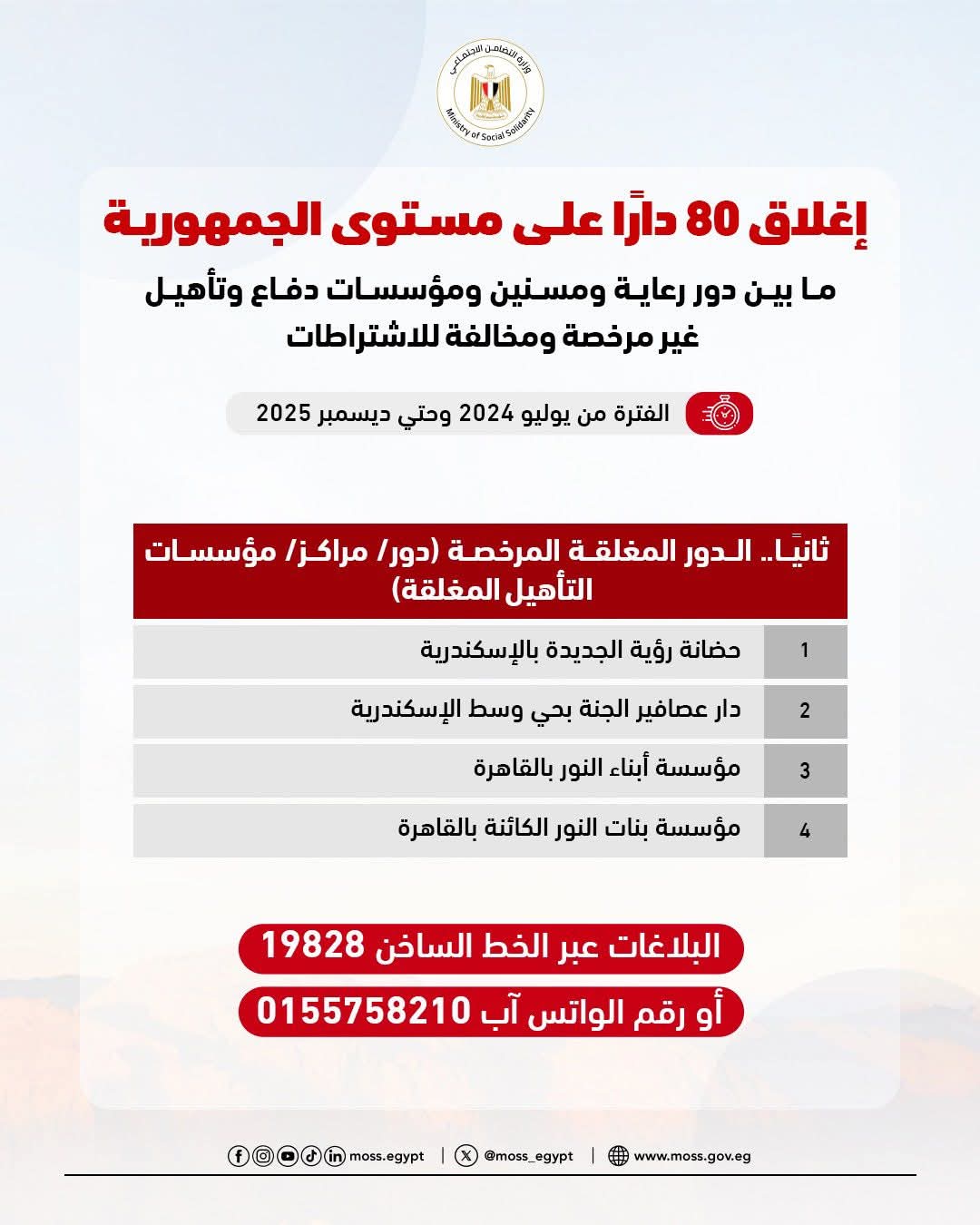 أعلنت وزارة التضامن الاجتماعي عن إغلاق 80 دارًا على مستوى الجمهورية، ما بين دور رعاية ومسنين ومؤسسات دفاع وتأهيل، لكونها غير مرخصة ومخالفة للاشتراطات خلال الفترة من يوليو 2024 وحتي ديسمبر 2025.